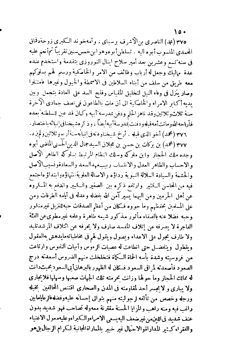 مُحَمَّد بن بَرَكَات بن حسن بن عجلَان السَّيِّد جمال الدّين الحسني الْمَاضِي أَبوهُ وجده ملك الْحجاز وَابْن ملوكه وسلك النظام المرتبط بسلوكه الطَّاهِر الأَصْل والاحساب وَالظَّاهِر الْعدْل والانتساب ربيب مهد السعد والسعادة ونسيب الأَصْل والحشمة والسيادة السلالة النَّبَوِيَّة رِدَاؤُهُ والأصالة العلوية انتهاؤه وابتداؤه اجْتمع فِيهِ من المحاسن الْكثير وارتفع ذكره بَين الصَّغِير وَالْكَبِير واندفع بِهِ الْمَكْرُوه عَن أهل الْحَرَمَيْنِ وَمن إِلَيْهِمَا يسير آمن الله بفضله وعدله فِي أَيَّامه الطرقات وَمن على الْمُسلمين بحفظهم وَمَا حووه فَكَانَ من أعظم الصَّدقَات حبه للتنزيل غير منكور وحبه فضلا عَنهُ بالصفاء مأثور مَذْكُور شِيمَة طَاهِرَة وَعلمه غير مطوى عَن الفئة الْفَاجِرَة لَا يصرفهُ عَن إِتْلَاف الْمُفْسد وَلَا يحرفه عَن ائتلاف المرشد تليد وَلَا طارف يجول على الْأَعْدَاء ويصول وَيَقُول لَهُم فِي مخاطباته مَا يدهش بِهِ الْعُقُول ويتطول ويتفضل حَتَّى انطاعت لَهُ عصيات الرؤوس وأبيات النُّفُوس وارتاعت من فروسيته وَشدَّة بأسه الحماة الكماة فتخلخلت مِنْهُم الضروس أسعدته درج الصعُود فأصعدته لمراقي السُّعُود فَكَانَ لَهُ الظُّهُور بالبرهان أبي السُّعُود بِحَيْثُ دَانَتْ لَهُ ممالك الْحجاز وَمَا حولهَا وزانت بحرمته تِلْكَ الْجِهَات صعبها وسهلها فَلَا يجاري وَلَا يباري وَلَا يَجْسُر أحد لمقاومته فِي المدن والصحاري اقتنص الْمُخَالفين بخيله وَرجله وخصص من تألفه لرجوليته مِنْهُم بتوالي إحسانه عَلَيْهِ وفضله فالرعايا مَا بَين رَاغِب فِيهِ وَمِنْه رَاهِب والمزايا الْحَسَنَة مقترنة مَعَه وَله تصاحب فَهُوَ شَدِيد بِدُونِ عنف فِي اللين غير ضعف إِلَيْهِ يسْعَى الْأُمَرَاء والكبراء وَعَلِيهِ معول الْأَغْنِيَاء والفقراء كثير المداراة وَالِاحْتِمَال غير خَبِير بالمماراة المجانبة لكرام الرِّجَال بل هُوَ