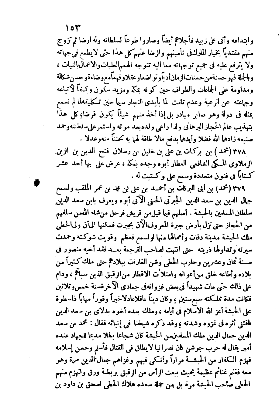 وابتداعه وأتى على زبيد فأجلاهم أَيْضا وصاروا طَوْعًا لسلطانه وَله أَرضًا ثمَّ تزوج مِنْهُم مقتديا بِخِيَار الْمُلُوك فِي تأمينهم وَالرِّضَا عَنْهُم كل هَذَا حَتَّى لَا يطْمع فِي جهاته وَلَا يترفع عَلَيْهِ فِي جَمِيع توجهاته مِمَّا إِلَيْهِ تتَوَجَّه الهمم العليات والأعمال بِالنِّيَّاتِ، ومداومة على الْجَمَاعَات وَالطّواف حِين كَونه بِمَكَّة ومزيد سُكُون وكفا لأتباعه وجماعته عَن الرّعية وَعدم تلفت بِمَا بأيدي التُّجَّار سِيمَا حِين تَكْلِيفه لما لم نسْمع بِمثلِهِ فِي دولة وَهُوَ صابر مبادر بل إِذا أَخذ مِنْهُم شَيْئا يكون قرضا كل هَذَا بتهذيب عَالم الْحجاز البرهاني وَلذَا رَاعى وَلَده بعد مَوته وَاسْتمرّ عل سلطنته وَحمد صَنِيعه زادهما الله فضلا وأيدهما بِدفع مَا لَا طَاقَة لَهما بِهِ تحننا مِنْهُ وعدلا.