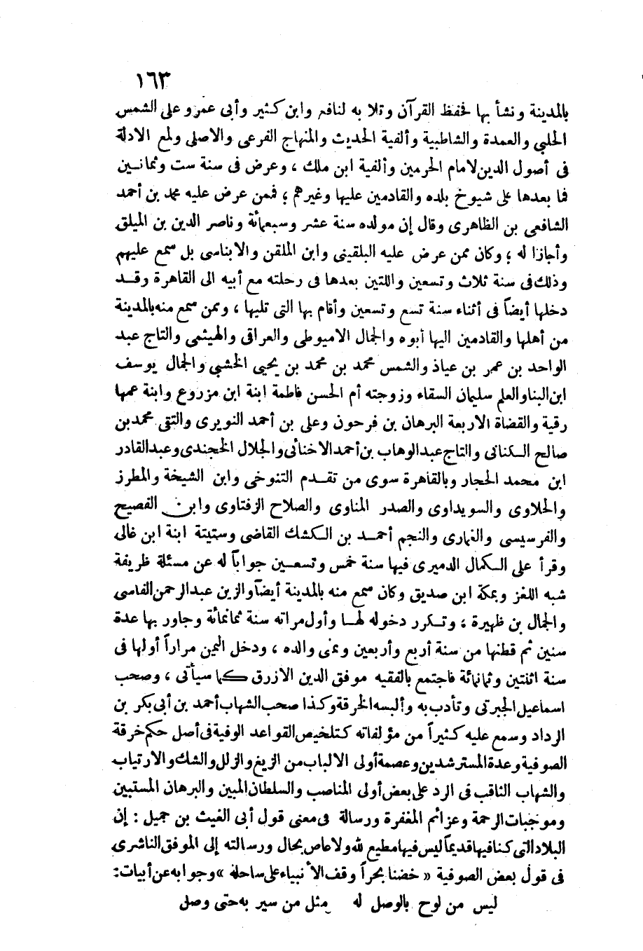 بِالْمَدِينَةِ وَنَشَأ لَهَا فحفظ الْقُرْآن وتلا بِهِ لنافع وَابْن كثير وَأبي عَمْرو على الشَّمْس الْحلَبِي والعمدة والشاطبية وألفية الحَدِيث والمنهاج الفرعي والأصلي ولمع الْأَدِلَّة فِي أصُول الدّين لإِمَام الْحَرَمَيْنِ وألفية ابْن مَالك، وَعرض فِي سنة سِتّ وَثَمَانِينَ فَمَا بعْدهَا على شُيُوخ بَلَده والقادمين عَلَيْهَا وَغَيرهم فَمن)