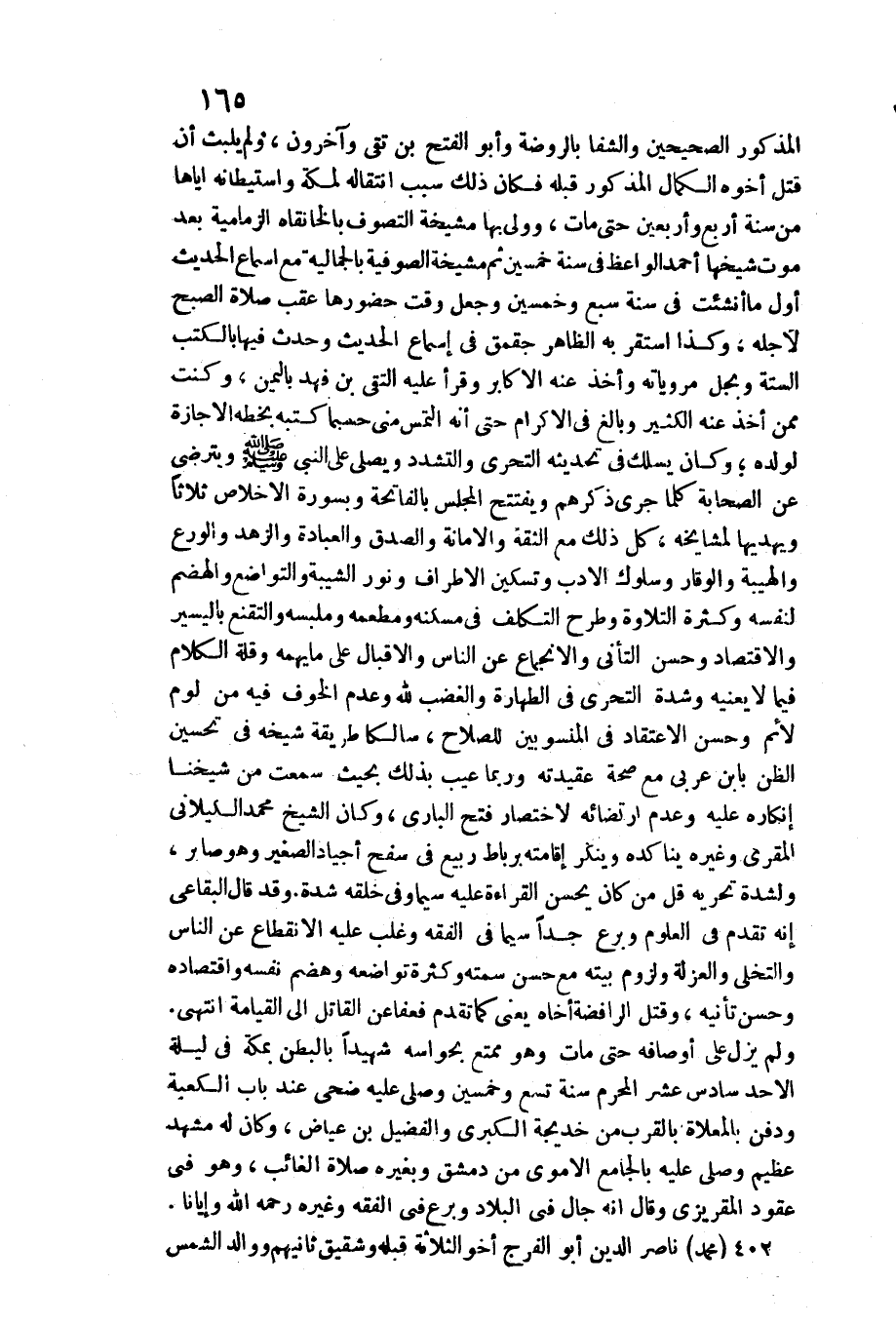 الْمَذْكُور الصَّحِيحَيْنِ والشفا بالروضة وَأَبُو الْفَتْح بن تَقِيّ وَآخَرُونَ، وَلم يلبث أَن قتل أَخُوهُ الْكَمَال الْمَذْكُور قبله فَكَانَ ذَلِك سَبَب انْتِقَاله لمَكَّة واستيطانه إِيَّاهَا من سنة أَربع وَأَرْبَعين حَتَّى مَاتَ، وَولي بهَا مشيخة التصوف بالخانقاة الزمامية بعد موت شيخها أَحْمد الْوَاعِظ فِي سنة خمسين ثمَّ مشيخة الصُّوفِيَّة بالجمالية مَعَ اسماع الحَدِيث أول مَا أنشئت فِي سنة سبع وَخمسين وَجعل وَقت حُضُورهَا عقب صَلَاة الصُّبْح لأَجله، وَكَذَا اسْتَقر بِهِ الظَّاهِر جقمق فِي إسماع الحَدِيث وَحدث فِيهَا بالكتب السِّتَّة وبجل مروياته وَأخذ عَنهُ الأكابر وَقَرَأَ عَلَيْهِ التقي بن فَهد بِالْيمن، وَكنت مِمَّن أَخذ عَنهُ الْكثير وَبَالغ فِي الْإِكْرَام حَتَّى أَنه التمس مني حَسْبَمَا كتبه بِخَطِّهِ الْإِجَازَة لوَلَده وَكَانَ يسْلك فِي تحديثه التَّحَرِّي والتشدد وَيُصلي على النَّبِي صلى الله عَلَيْهِ وَسلم ويترضى عَن الصَّحَابَة كلما جرى ذكرهم ويفتتح الْمجْلس بِالْفَاتِحَةِ وبسورة الْإِخْلَاص ثَلَاثًا ويهديها لمشايخه، كل ذَلِك مَعَ الثِّقَة وَالْأَمَانَة والصدق وَالْعِبَادَة والزهد والورع والهيبة وَالْوَقار وسلوك الْأَدَب وتسكين الْأَطْرَاف وَنور الشيبة والتواضع والهضم لنَفسِهِ وَكَثْرَة التِّلَاوَة وَطرح التَّكَلُّف فِي مَسْكَنه ومطعمه وملبسه والتقنع باليسير والاقتصاد وَحسن التأني والإنجماع عَن النَّاس والإقبال على مَا يهمه وَقلة الْكَلَام فِيمَا لَا يعنيه وَشدَّة التَّحَرِّي فِي الطَّهَارَة وَالْغَضَب لله وَعدم الْخَوْف فِيهِ من لوم لائم وَحسن الِاعْتِقَاد فِي المنسوبين للصلاح، سالكا طَريقَة شَيْخه فِي تَحْسِين الظَّن بِابْن عَرَبِيّ مَعَ صِحَة عقيدته وَرُبمَا عيب بذلك بِحَيْثُ سَمِعت من شَيخنَا إِنْكَاره عَلَيْهِ وَعدم ارتضائه لاختصار فتح الْبَارِي، وَكَانَ الشَّيْخ مُحَمَّد الكيلاني الْمقري وَغَيره يناكده وينكر إِقَامَته برباط ربيع فِي سفح أجياد الصَّغِير وَهُوَ صابر، ولشدة تحريه قل من كَانَ يحسن الْقِرَاءَة عَلَيْهِ سِيمَا وَفِي خلقه وَشدَّة. وَقد قَالَ البقاعي إِنَّه تقدم فِي الْعُلُوم وبرع جدا سِيمَا فِي الْفِقْه وَغلب عَلَيْهِ الِانْقِطَاع عَن النَّاس والتخلي وَالْعُزْلَة وَلُزُوم بَيته مَعَ حسن سمته وَكَثْرَة تواضعه وهضم نَفسه واقتصاده وَحسن تأنيه، وَقتل الرافضة أَخَاهُ يَعْنِي كَمَا تقدم فَعَفَا عَن الْقَاتِل إِلَى الْقِيَامَة انْتهى.