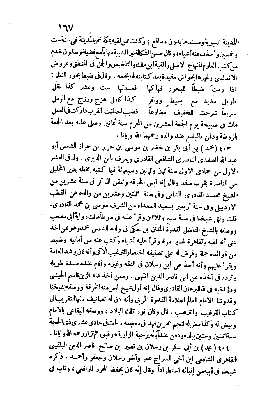 الْمَدِينَة والنبوية ومسندها بِدُونِ مدافع وَكنت مِمَّن لقِيه بِمَكَّة ثمَّ بِالْمَدِينَةِ فِي سنة سِتّ وَخمسين وَأخذت عَنهُ أَشْيَاء، وَكَانَ حسن الشكالة نير الشيبة مهابا مَعَ فَضِيلَة وَسُكُون خدم من كتب الْعُلُوم الْمِنْهَاج الْأَصْلِيّ وألفية ابْن ملك وَالتَّلْخِيص والجمل فِي الْمنطق وعروض الأندلسي وَغَيرهَا بحواش مفيدة بعد كِتَابَته لَهَا بِخَطِّهِ. وَقَالَ فِي ضبط بحور النّظم