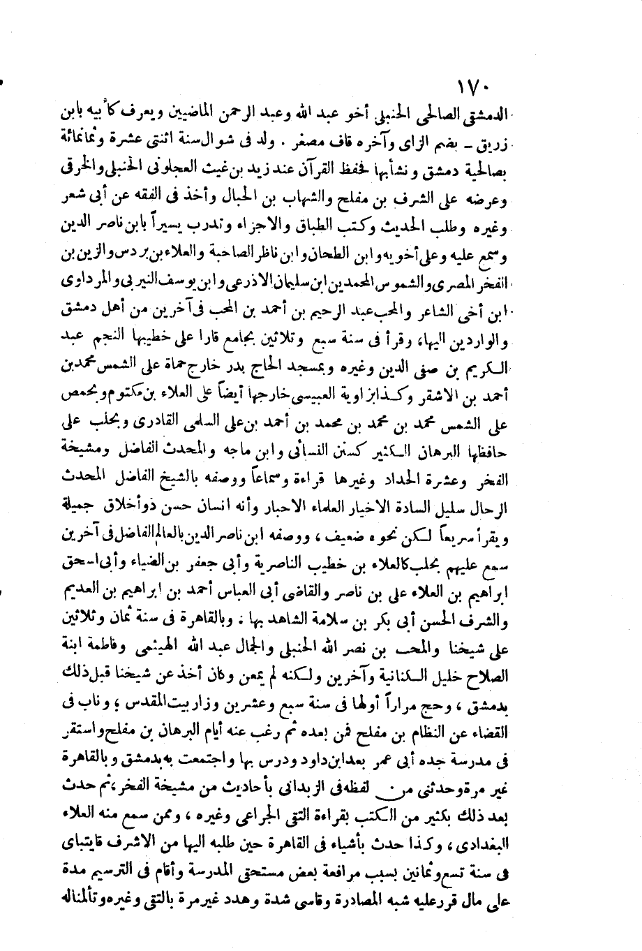 إِبْرَاهِيم بن الْعَلَاء عَليّ بن نَاصِر اللقاضي أبي الْعَبَّاس أَحْمد بن إِبْرَاهِيم بن العديم والشرف الْحسن أبي بكر بن سَلامَة الشَّاهِد بهَا، وبالقاهرة فِي سنة ثَمَان وَثَلَاثِينَ على شَيخنَا والمحب بن نصر الله الْحَنْبَلِيّ وَالْجمال عبد الله الهيثمي وَفَاطِمَة ابْنة الصّلاح خَلِيل الكنانية وَآخَرين وَلكنه لم يمعن وَكَانَ أَخذ عَن شَيخنَا قبل ذَلِك بِدِمَشْق، وَحج مرَارًا أَولهَا فِي سنة سبع وَعشْرين وزار بَيت الْمُقَدّس وناب فِي الْقَضَاء عَن النظام بن مُفْلِح فَمن بعده ثمَّ رغب عَنهُ أَيَّام الْبُرْهَان بن مُفْلِح وَاسْتقر فِي مدرسة جده أبي عمر بعد ابْن دَاوُد ودرس بهَا وَاجْتمعت بِهِ بِدِمَشْق وبالقاهرة غير مرّة وحَدثني من لَفظه الزبداني بِأَحَادِيث من مشيخة الْفَخر، ثمَّ حدث بعد ذَلِك بِكَثِير من الْكتب بِقِرَاءَة التقي الجراعي وَغَيره، وَمِمَّنْ سمع مِنْهُ الْعَلَاء الْبَغْدَادِيّ، وَكَذَا حدث بأَشْيَاء فِي الْقَاهِرَة حِين طلبه إِلَيْهَا من الإشراف قايتباي فِي سنة تسع وَثَمَانِينَ بِسَبَب مرافعة بعض مستحقي الْمدرسَة وَأقَام فِي الترسيم مُدَّة على مَال قرر عَلَيْهِ شبه المصادرة وقاسي شدَّة وهدد غير مرّة بالتقي وَغَيره وتألمنا لَهُ