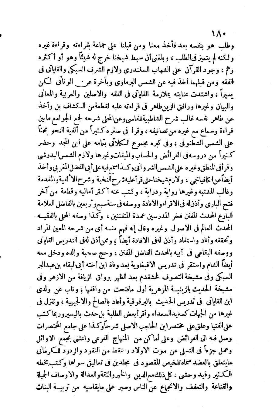 وَطلب هُوَ بِنَفسِهِ بعد فَأخذ مَعنا وَمن قبلنَا على جمَاعَة بقرَاءَته وَقِرَاءَة غَيره وَلكنه لم يتَمَيَّز فِي الطِّبّ، وَبَلغنِي أَن سبط شَيخنَا خرج لَهُ شَيْئا وَهُوَ أَو أَكْثَره وهم، وجود الْقُرْآن على الشهَاب السكندري ولازم الشّرف السُّبْكِيّ والقاياتي فِي الْفِقْه وَمن قبلهمَا أَخذ فِيهِ عَن الشَّمْس الْبرمَاوِيّ وبأخره عَن الونائي لَكِن يَسِيرا، واشتدت عنايته بملازمة القاياتي فِي الْفِقْه والأصلين والعربية والمعاني وَالْبَيَان وَغَيرهَا ورافق الزين طَاهِر فِي قِرَاءَته عَلَيْهِ لقطعة من الْكَشَّاف بل وَأخذ عَن طَاهِر نَفسه غَالب شرح الشاطبية للفاسي وَعَن الْمحلي شَرحه لجمع الْجَوَامِع مَا بَين قِرَاءَة وَسَمَاع مَعَ غَيره من تصانيفه، وَقَرَأَ فِي حَضَره كثيرا من ألفية النَّحْو بحثا على الشَّمْس الشطنوفي، وَفِي كبره مَجْمُوع الكلائي بِتَمَامِهِ على ابْن الْمجد وَحضر كثيرا من دروسه فِي الْفَرَائِض والحساب والميقات وَغَيرهَا ولازم الشَّمْس البدرشي وَقَرَأَ فِي الْمنطق وَغَيره على الشَّمْس الشرواني وَكَذَا سمع فِيهِ على أبي الْفضل المغربي وَأخذ أَيْضا عَن الكافياجي، ولازم شَيخنَا حَتَّى قَرَأَ عَلَيْهِ النخبة وَشرح الألفية والمقدمة وغالب المشتبه وَغَيرهَا رِوَايَة ودراية، وَكتب عَنهُ أَكثر أَمَالِيهِ وَقطعَة من آخر فتح الْبَارِي وَأذن لَهُ فِي الْأَقْرَاء والإفادة وَوَصفه فِي سنة سبع وَأَرْبَعين بالفاضل الْعَلامَة البارع الْمُحدث المفنن فَخر المدرسين عُمْدَة المتفننين، وَكَذَا وَصفه الْمحلي بالفقيه الْمُحدث الْعَالم فِي الْأُصُول وَغَيره وَقَالَ إِنَّه فهم مِنْهُ أَي من شَرحه الْمعِين المُرَاد وتحققه وَأفَاد واستفاد وَأذن لَهُ فِي الإفادة أَيْضا وَمِمَّنْ أذن لَهُ فِي التدريس القاياتي وَوَصفه البقاعي فِي أَبِيه بالمحدث الْفَاضِل المفنن، وَحج صُحْبَة وَالِده وَدخل مَعَه أَيْضا الشَّام وَاسْتقر فِي تدريس الاقبغاوية بعد وَفَاة ابْن أُخْته أبي الْبَقَاء بن عبد الْبر السُّبْكِيّ وَفِي مشيخة التصوف لخشقدم بعد الظّهْر برواق الريافة من الْأَزْهَر وَفِي مشيخة الحَدِيث بالزينية المزهرية أول مَا فتحت من واقفها وناب عَن وَلَدي ابْن القاياتي فِي تدريس الحَدِيث بالبرقوقية وَأعَاد بالصالح والأبجيهية، وتنزل فِي غَيرهَا من الْجِهَات كسعيد السُّعَدَاء وأقرأ بعض الطّلبَة بل حدث باليسير وَرُبمَا كتب على ألفيتا وعلق على مُخْتَصر ابْن الْحَاجِب الْأَصْلِيّ شرحا وَكَذَا على جَامع المختصرات وصل فِيهِ إِلَى الْفَرَائِض وعَلى أَمَاكِن من الْمِنْهَاج الفرعي واعتنى بِجمع الْأَوَائِل وَعمل جُزْءا فِي التسلي عَن موت الْأَوْلَاد والتقط من النُّقُود والردود للكرماني مَا)