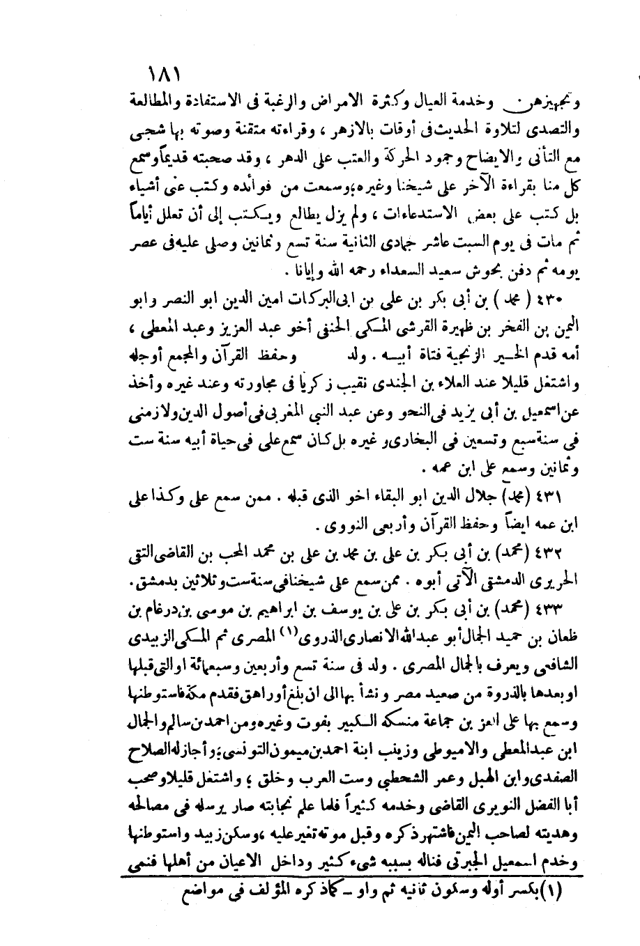 وتجهيزهن وخدمة الْعِيَال وَكَثْرَة الْأَمْرَاض وَالرَّغْبَة فِي الاستفادة والمطالعة والتصدي لتلاوة الحَدِيث فِي أَوْقَات بالأزهر، وقراءته متقنة وصوته بهَا شجي مَعَ التأني والإيضاح وجمود الْحَرَكَة العتب على الدَّهْر، وَقد صحبته قَدِيما وَسمع كل منا بِقِرَاءَة الآخر على شَيخنَا وَغَيره وَسمعت من فَوَائده وَكتب عني أَشْيَاء بل كتب على بعض الاستدعاءات، وَلم يزل يطالع وَيكْتب إِلَى أَن تعلل أَيَّامًا ثمَّ مَاتَ فِي يَوْم السبت عَاشر جُمَادَى الثَّانِيَة سنة تسع وَثَمَانِينَ وَصلى عَلَيْهِ فِي عصر يَوْمه ثمَّ دفن بحوش سعيد السُّعَدَاء رَحمَه الله وإيانا.