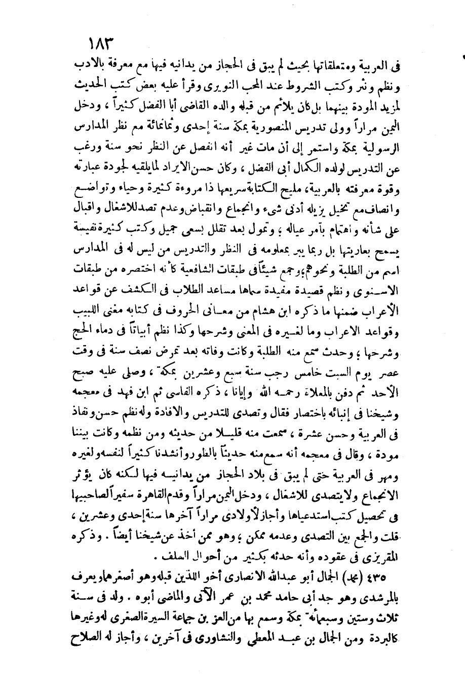 فِي الْعَرَبيَّة ومتعلقاتها بِحَيْثُ لم يبْق فِي الْحجاز من يدانيه فِيهَا مَعَ معرفَة بالأدب ونظم ونثر وَكتب الشُّرُوط عِنْد الْمُحب النويري وَقَرَأَ عَلَيْهِ بعض كتب الحَدِيث لمزيد من الْمَوَدَّة بَينهمَا بل كَانَ يلائم من قبله وَالِده القَاضِي أَبَا الْفضل كثيرا، وَدخل الْيمن مرَارًا وَولي تدريس المنصورية بِمَكَّة سنة إِحْدَى وَثَمَانمِائَة مَعَ نظر الْمدَارِس الرسولية بِمَكَّة وَاسْتمرّ إِلَى أَن مَاتَ غير أَنه انْفَصل عَن النّظر نَحْو سنة وَرغب عَن التدريس لوَلَده الْكَمَال أبي الْفضل، وَكَانَ حسن الايراد لما يلقيه لجودة عِبَارَته وَقُوَّة مَعْرفَته بِالْعَرَبِيَّةِ، مليح الْكِتَابَة سريعها ذَا مُرُوءَة كَثِيرَة وحياء وتواضع وانصاف مَعَ تخيل يُزِيلهُ أدنى شئ وانجماع وانقباض وَعدم تصد للأشغال وإقبال على شَأْنه واهتمام بِأَمْر عِيَاله وتمول بعد تقلل بسعي جميل وَكتب كَثِيرَة نفيسة يسمح بعاريتها بل رُبمَا يبر بمعلومه فِي النّظر والتدريس من لَيْسَ لَهُ فِي الْمدَارِس اسْم من الطّلبَة وَنَحْوهم وَجمع شَيْئا فِي طَبَقَات الشَّافِعِيَّة كَأَنَّهُ اخْتَصَرَهُ من طَبَقَات الأسنوي ونظم قصيدة مفيدة سَمَّاهَا مساعد الطلاب فِي الْكَشْف عَن قَوَاعِد الْأَعْرَاب ضمنهَا مَا ذكره ابْن هِشَام من مَعَاني الْحُرُوف فِي كِتَابه مغنى اللبيب وقواعد الْإِعْرَاب وَمَا لغيره فِي الْمَعْنى وَشَرحهَا وَكَذَا نظم أبياتا فِي دِمَاء الْحَج وَشَرحهَا وَحدث سمع مِنْهُ الطّلبَة وَكَانَت وَفَاته بعد تمرض نصف سنة فِي وَقت عصر يَوْم السبت خَامِس رَجَب سنة سبع وَعشْرين بِمَكَّة، وَصلى عَلَيْهِ صبح الْأَحَد ثمَّ دفن بالمعلاء رَحمَه الله وإيانا، ذكره الفاسي ثمَّ ابْن فَهد فِي مُعْجَمه وَشَيخنَا فِي إنبائه بِاخْتِصَار فَقَالَ وتصدى للتدريس والإفادة وَله نظم حسن ونفاذ فِي الْعَرَبيَّة وَحسن عشرَة، سَمِعت مِنْهُ قَلِيلا من حَدِيثه وَمن نظمه كَانَت بَيْننَا مَوَدَّة، وَقَالَ فِي مُعْجَمه أَنه سمع مِنْهُ حَدِيثا بِالطورِ وأنشدنا كثيرا لنَفسِهِ وَلغيره وَمهر فِي الْعَرَبيَّة حَتَّى لم يبْق فِي بِلَاد الْحجاز من يدانيه فِيهَا لكنه كَانَ يُؤثر الانجماع وَلَا يتَصَدَّى للأشغال، وَدخل الْيمن مرَارًا وَقدم الْقَاهِرَة سفيرا لصاحبيها فِي تَحْصِيل كتب استدعياها وَأَجَازَ لأولادي مرَارًا آخرهَا سنة إِحْدَى وَعشْرين، قلت وَالْجمع)