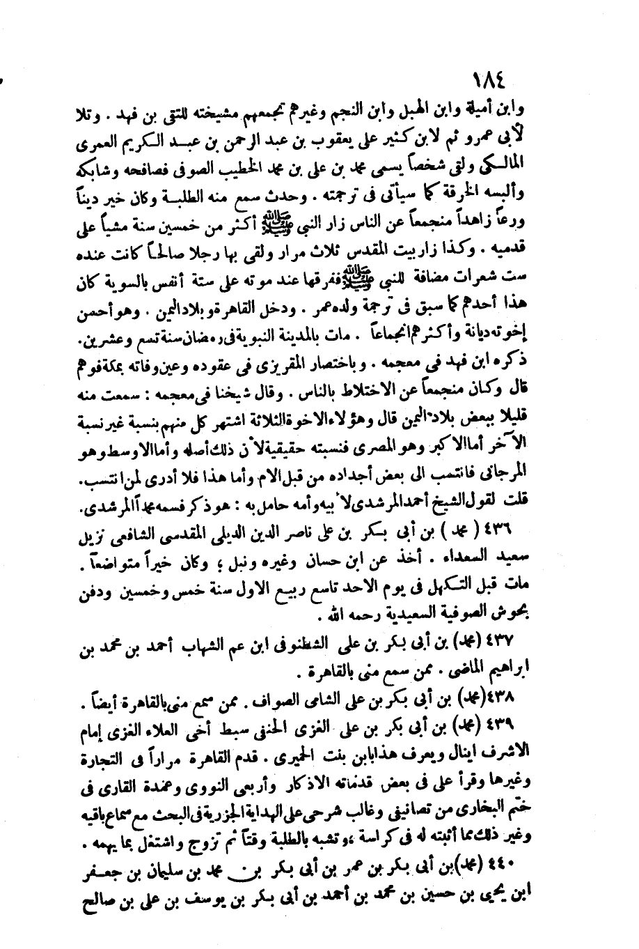 وَابْن أميلة وَابْن الهبل وَابْن النَّجْم وَغَيرهم تجمعهم مشيخته للتقي بن فَهد. وتلا لأبي عَمْرو ثمَّ لِابْنِ كثير عَليّ يَعْقُوب بن عبد الرَّحْمَن بن عبد الْكَرم الْعمريّ الْمَالِكِي وَلَقي شخصا يُسمى مُحَمَّد بن عَليّ بن مُحَمَّد الْخَطِيب الصُّوفِي فصافحه وشابكه وَألبسهُ الْخِرْقَة كَمَا سَيَأْتِي فِي تَرْجَمته. وَحدث سمع مِنْهُ الطّلبَة وَكَانَ خير دينا ورعا زاهدا منجمعا عَن النَّاس زار النَّبِي صلى الله عَلَيْهِ وَسلم أَكثر من خمسين سنة شَيْئا على قَدَمَيْهِ. وَكَذَا زار بَيت الْمُقَدّس ثَلَاث مرار وَلَقي بهَا رجلا صَالحا كَانَت عِنْده سِتّ شَعرَات مُضَافَة للنَّبِي صلى الله عَلَيْهِ وَسلم ففرقها عِنْد مَوته على سِتَّة أنفس بِالسَّوِيَّةِ كَانَ هَذَا أحدهم كَمَا سبق فِي تَرْجَمَة وَلَده عمر. وَدخل الْقَاهِرَة وبلاد الْيمن. وَهُوَ أحسن إخْوَته ديانَة وَأَكْثَرهم إنجماعا. مَاتَ بِالْمَدِينَةِ النَّبَوِيَّة فِي رَمَضَان سنة تسع وَعشْرين. ذكره ابْن فَهد فِي مُعْجَمه. وباختصار المقريزي فِي عقوده وَعين وَفَاته بِمَكَّة فَوَهم قَالَ وَكَانَ منجمعا عَن الِاخْتِلَاط بِالنَّاسِ. وَقَالَ شَيخنَا فِي مُعْجَمه: سَمِعت مِنْهُ قَلِيلا بِبَعْض بِلَاد الْيمن قَالَ وَهَؤُلَاء الْأُخوة الثَّلَاثَة اشْتهر كل مِنْهُم بِنِسْبَة غير نِسْبَة الآخر أما الْأَكْبَر وَهُوَ الْمصْرِيّ فنسبته حَقِيقَة لِأَن أَصله وَأما الْأَوْسَط وَهُوَ الْمرْجَانِي فانتسب إِلَى بعض أجداده من قبل الْأُم وَأما هَذَا فَلَا أَدْرِي لمن انتسب. قلت لقَوْل الشَّيْخ أَحْمد المرشدي لِأَبِيهِ وَأمه حَامِل بِهِ: هُوَ ذكر فسمه مُحَمَّدًا المرشدي.