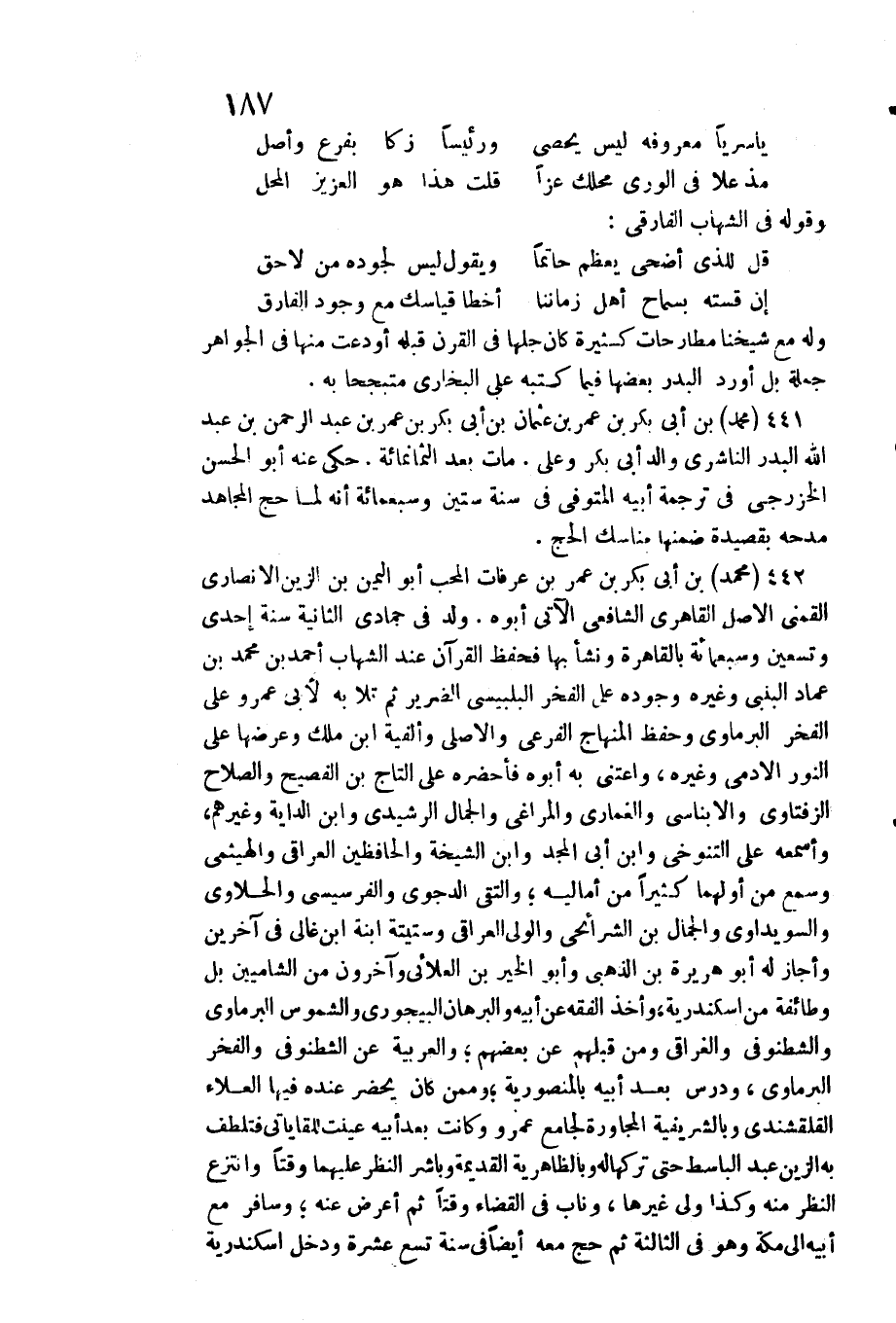 مُحَمَّد بن أبي بكر بن عمر بن عَرَفَات الْمُحب أَبُو الْيمن بن الزين الْأنْصَارِيّ القمني الصل القاهري الشَّافِعِي الْآتِي أَبوهُ. ولد فِي جُمَادَى الثَّانِيَة سنة إِحْدَى وَتِسْعين وَسَبْعمائة بِالْقَاهِرَةِ وَنَشَأ بهَا فحفظ الْقُرْآن عِنْد الشهَاب أَحْمد بن مُحَمَّد بن عماد البنبي وَغَيره وجوده على الْفَخر البلبيسي الضَّرِير ثمَّ تَلا بِهِ لأبي عَمْرو على الْفَخر الْبرمَاوِيّ وَحفظ الْمِنْهَاج الفرعي والأصلي وألفية ابْن ملك وعرضها على النُّور الدمي وَغَيره، واعتنى بِهِ أَبوهُ فَأحْضرهُ على التَّاج بن الفصيح وَالصَّلَاح الزفتاوي والأبناسي والغماري والمراغي وَالْجمال الرَّشِيدِيّ وَابْن الداية وَغَيرهم، وأسمعه على التنوخي وَابْن أبي الْمجد وَابْن الشيخة والحافظين الْعِرَاقِيّ والهيثمي وَسمع من أَولهمَا كثيرا من أَمَالِيهِ والتقي الدجوى والفرسيسي والحلاوي والسويداوي وَالْجمال بن الشرائحي وَالْوَلِيّ الْعِرَاقِيّ وستيتة ابْنة ابْن غالي فِي آخَرين وَأَجَازَ لَهُ أَبُو هُرَيْرَة بن الذَّهَبِيّ وَأَبُو الْخَيْر بن العلائي وَآخَرُونَ من الشاميين بل وَطَائِفَة من اسكندرية، وَأخذ الْفِقْه عَن أيه والبرهان البيجوري والشموس الْبرمَاوِيّ والشطنوفي والغراقي وَمن قبلهم عَن بَعضهم والعربية عَن الشطنوفي وَالْفَخْر الْبرمَاوِيّ، ودرس بعد أَبِيه بالمنصورية وَمِمَّنْ كَانَ يحضر عِنْده فِيهَا الْعَلَاء القلقشندي وبالشريفية الْمُجَاورَة لجامع عَمْرو وَكَانَت بعد أَبِيه عينت اللقاياتي فتلطف بِهِ الزين عبد الباسط حَتَّى تَركهَا لَهُ وبالظاهرية الْقَدِيمَة وباشر النّظر عَلَيْهِمَا وقتا وانتزع النّظر مِنْهُ وَكَذَا ولي غَيرهَا، وناب فِي الْقَضَاء وقتا ثمَّ أعرض عَنهُ وسافر مَعَ أَبِيه إِلَى مَكَّة وَهُوَ فِي الثَّالِثَة ثمَّ حج مَعَه أَيْضا فِي سنة تسع عشرَة وَدخل اسكندرية
