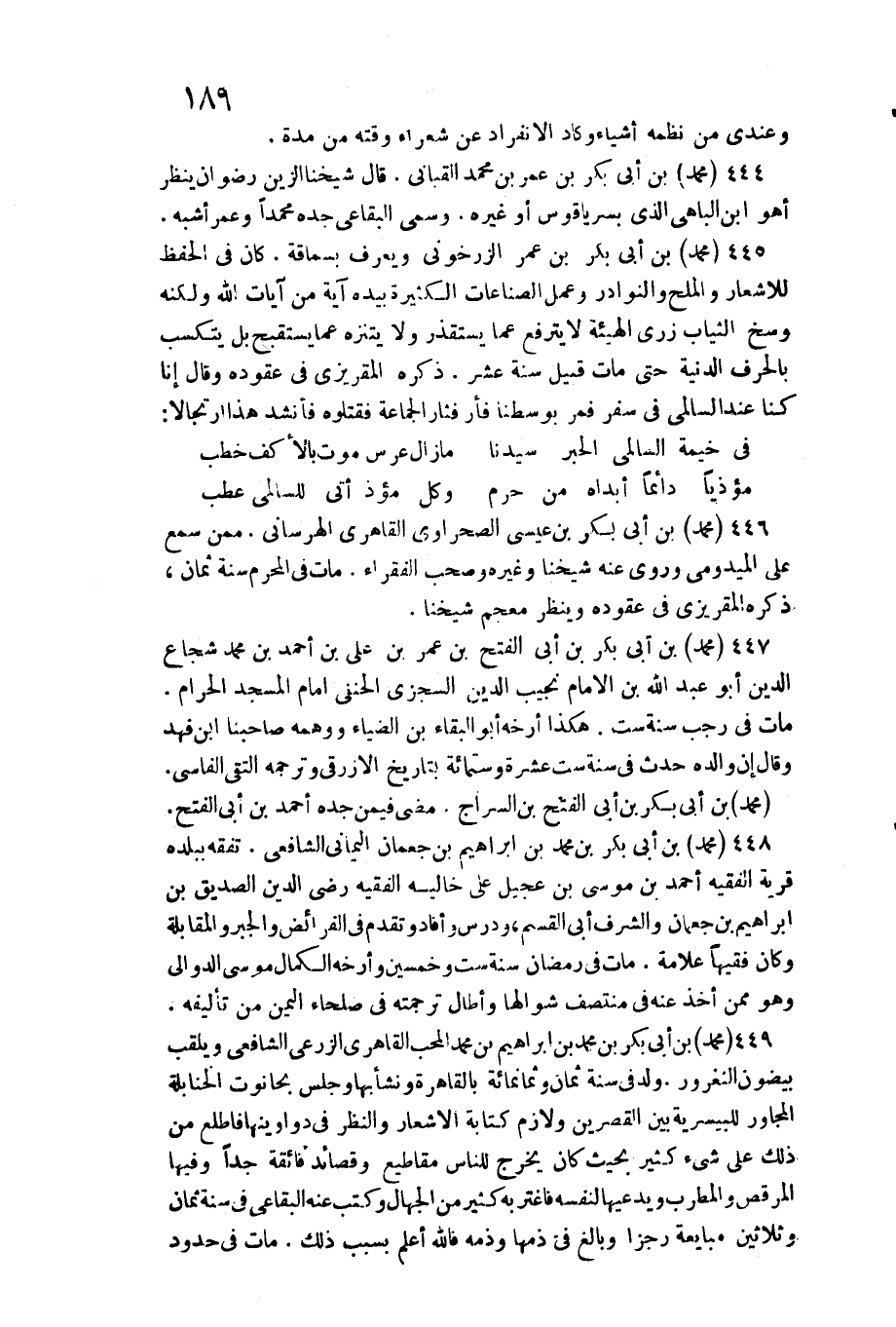 المجاور للبيسرية بَين القصرين ولازم كِتَابَة الْأَشْعَار وَالنَّظَر فِي دواوينها فَاطلع من ذَلِك على شئ كثير بِحَيْثُ كَانَ يخرج للنَّاس مقاطيع وقصائد فائقة جدا وفيهَا المرقص والمطرب ويدعيها لنَفسِهِ فاغتر بِهِ كثير من الْجُهَّال وَكتب عَنهُ البقاعي فِي سنة ثَمَان وَثَلَاثِينَ مبايعتة رجزا وَبَالغ فِي ذمها فَالله أعلم بِسَبَب ذَلِك. مَاتَ فِي حُدُود
