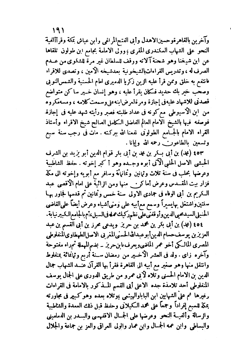 وَآخَرين بِالْقَاهِرَةِ وحسين الأهدل وَأبي الْفَتْح المراغي وَابْن عَيَّاش بِمَكَّة وَقَرَأَ ألفية النَّحْو على الشهَاب السكندري الْمقري وَولي الْإِمَامَة بِجَامِع ابْن طولون تلقاها عَن ابْن شَيخنَا وَهُوَ شحنة آلاته ووقف للسُّلْطَان غير مرّة للشكوى من عدم الصّرْف لَهُ، وتدريس الْقرَاءَات بالشيخونية بعد شيخة الْأمين، وتصدى للأقراء فَانْتَفع بِهِ خلق وَمِمَّنْ قَرَأَ عَلَيْهِ الزين زَكَرِيَّا الدَّمِيرِيّ إِمَام الحسنية وَالشَّمْس النوبي وَصَحب خير بك حَدِيد فَكَانَ يقْرَأ عَلَيْهِ، وَهُوَ إِنْسَان خير سَاكن متواضع قصدني للاشهاد عَلَيْهِ فِي إجَازَة وَمرَّة لعرض ابْنه عَليّ وَسمعت كَلَامه، ومسه مَكْرُوه من ابْن الاسيوطي مَعَ كَونه فِي عداد طلبته فَصَبر ورأيته شهد عَلَيْهِ فِي إجَازَة فوصفه فِيهَا بالشيخ الإِمَام الْعَالم الْفَاضِل الْكَامِل الصَّالح شيخ الإقراء وأستاذ الْقُرَّاء الإِمَام بالجامع الطولوني نفعنا الله ببركته. مَاتَ فِي رَجَب سنة سبع وَتِسْعين بالطاعون رَحمَه الله وإيانا.