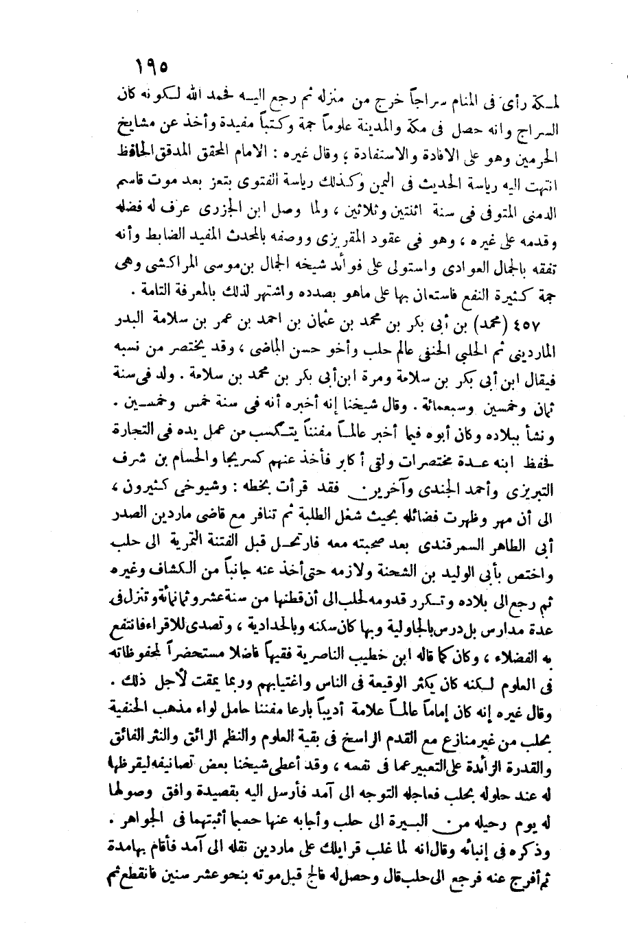 مُحَمَّد بن أبي بكر بن مُحَمَّد بن عُثْمَان بن أَحْمد بن عمر بن سَلامَة الْبَدْر المارديني ثمَّ الْحلَبِي الْحَنَفِيّ عَالم حلب واخو حسن الْمَاضِي، ويختصر من نسبه فَيُقَال ابْن أبي بكر بن سَلامَة وَمرَّة ابْن أبي بكر بن مُحَمَّد بن سَلامَة. ولد فِي سنة ثَمَان وَخمسين وَسَبْعمائة. وَقَالَ شَيخنَا إِنَّه أخبرهُ أَنه فِي سنة خمس وَخمسين. ونشا ببلاده وَكَانَ أَبوهُ فِيمَا أخبر عَالما مفننا يتكسب من عمل يَده فِي التِّجَارَة فحفظ ابْنه عدَّة مختصرات وَلَقي أكَابِر فَأخذ عَنْهُم كسريجا والحسام بن شرف التبريزي وَأحمد الجندي وَآخَرين فقد قَرَأت بِخَطِّهِ: وشيوخي كَثِيرُونَ، إِلَى أَن مهر وَظَهَرت فضائله بِحَيْثُ شغل الطّلبَة ثمَّ تنافر مَعَ قَاضِي ماردين الصَّدْر أبي)