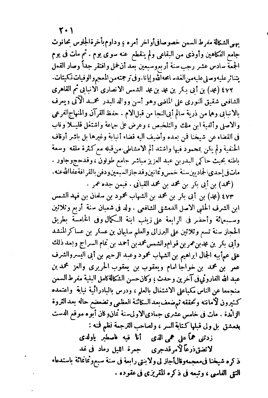 مُحَمَّد بن أبي بكر بن مُحَمَّد بن الشهَاب مَحْمُود بن سلمَان فَهد الشَّمْس ابْن الشّرف وأحضر فِي الرَّابِعَة على زَيْنَب ابْنة الْكَمَال وَفِي الْخَامِسَة بطرِيق الْحجاز سنة تسع وَثَلَاثِينَ على البرزالي وَالْعلم سُلَيْمَان بن عَسْكَر بن عَسَاكِر المنشد وَأبي بكر بن مُحَمَّد بن قوام وَالشَّمْس مُحَمَّد بن أَحْمد بن تَمام السراج وَبعد ذَلِك عَليّ عَم أَبِيه الْجمال إِبْرَاهِيم بن الشهَاب ومحمود وَعبد الرَّحِيم بن أبي الْيُسْر والشرف عمر بن مُحَمَّد بن خواجا إِمَام وَيَعْقُوب بن يَعْقُوب الحريري والعز مُحَمَّد بن عبد الله الفاروثي فِي آخَرين وَحدث وَكَانَ حسن الشكالة كَامِل البنية مفرط السّمن منجمعا عَن النَّاس مكبا على الِاشْتِغَال بالغلم، ودرس بالبادرائية نِيَابَة وَاعْتَمدهُ كَثِيرُونَ لأمانته وتحققه ثمَّ ضعف بعد الكائنة الْعُظْمَى وتضعضع حَاله بعد الثروة الزَّائِدَة. مَاتَ فِي خَامِس عشرَة جُمَادَى الأولى سنة ثَمَان وَكَانَ أَبوهُ موقع الدست بِدِمَشْق بل ولي قبلهَا كِتَابَة اسر، وَلِصَاحِب التَّرْجَمَة نظم فَمِنْهُ: