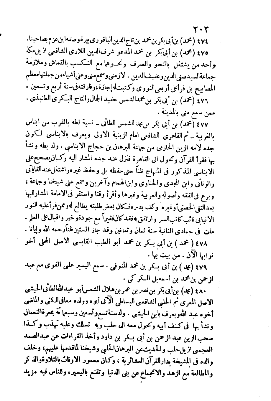 مُحَمَّد بن أبي بكر بن مُحَمَّد الشَّمْس الطَّائِي نِسْبَة لطه بِالْقربِ من انباس بالغربية ثمَّ القاهري الشَّافِعِي إِمَام الزينية الأولى وَيعرف بالأبناسي لكَون جده لأمه الزين الْحَازِمِي من جمَاعَة الْبُرْهَان بن حجاج الأبناسي. ولد بطه وَنَشَأ بهَا فَقَرَأَ الْقُرْآن وتحول إِلَى الْقَاهِرَة فَنزل عِنْد جده الْمشَار إِلَيْهِ كَانَ يصحح على الأبناسي الْمَذْكُور فِي الْمِنْهَاج ظنا حَتَّى حفظه بل وَحفظ غَيره واشتغل عَن القاياتي والونائي وَابْن الْمجد والحناوي وَابْن الْهمام وَآخَرين وَسمع على شَيخنَا وَجَمَاعَة، وبرع فِي الْفِقْه وأصوله والعربية وَغَيرهَا وأقرأ وقتا وَاسْتقر فِي الْإِمَامَة الْمشَار إِلَيْهَا بعد التقي الحصني أَو غَيره وكف بَصَره فَكَانَ بعض طلبته يطالع لَهُ وَمِمَّنْ قَرَأَ عَلَيْهِ على الْعلم. مَاتَ فِي جُمَادَى الثَّانِيَة سنة ثَمَان وَثَمَانِينَ ظنا رَحمَه الله وإيانا.