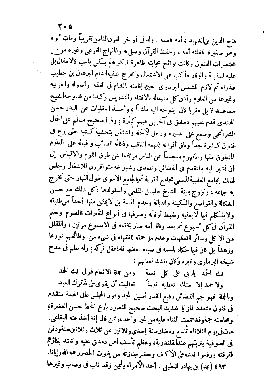 فتح الدّين بن الشَّهِيد، أمه فَاطِمَة. ولد فِي أَوَاخِر الْقرن الثَّامِن تَقْرِيبًا وَمَات أَبوهُ وه صَغِير فكلفته أمه، وَحفظ الْقُرْآن وَصلى بِهِ والمنهاج الفرعي وَغَيره من مختصرات الْفُنُون وَكَانَت لوائح نجابته ظَاهِرَة لكَونه لم يكن يلْعَب كالأطفال بل عَلَيْهِ السكينَة وَالْوَقار فأكب على الِاشْتِغَال وَتخرج بفقيه الشَّام الْبُرْهَان بن خطيب عذراء ثمَّ لَازم الشَّمْس الْبرمَاوِيّ حِين إِقَامَته بِالشَّام فِي الْفِقْه وأصوله والعربية وَغَيرهَا من الْعُلُوم وَأذن كل مِنْهُمَا لَهُ بالافتاء والتدريس وَكَذَا من شُيُوخه مساعد نزيل عقربا كَانَ يتَوَجَّه إِلَيْهِ مَاشِيا وَأخذ العقليات عَن الْبَدْر حسن الْهِنْدِيّ قدم عَلَيْهِم دمشق فِي آخَرين فيهم كَثْرَة وَقَرَأَ صَحِيح مُسلم على الْجمال الشرائحي وَسمع على غَيره ورحل لأَجله واشتغل بتحشية كتبه حَتَّى برع فِي فنون كَثِيرَة جدا وفَاق أقرانه بفهمه الثاقب زذكائه الصائب وإقباله على الْعُلُوم الْمَنْطُوق مِنْهَا وَالْمَفْهُوم منجمعا عَن النَّاس مرتفعا عَن طرق اللوم والإلباس إِلَى أَن أُشير إِلَيْهِ بالتقدم فِي الْفَضَائِل وتصدى وشيوخه متوافرون للاشغال وَجلسَ لذَلِك بِجَامِع العقيبة الْمُسَمّى بِجَامِع التَّوْبَة ثمَّ بالجامع الْأمَوِي وَطول النَّهَار حَتَّى تخرج بِهِ جمَاعَة، وَتزَوج بابنة الشَّيْخ خَلِيل القعي واستولدها، كل ذَلِك مَعَ حسن الشكالة والتواضع والسكينة والديانة وَعدم الْغَيْبَة بل لَا يُمكن مِنْهَا أحدا من طلبته وَلَا يتَكَلَّم فِيمَا لَا يعنيه وَضبط أوقاته وصرفها فِي أَنْوَاع الْخيرَات كَالصَّوْمِ وَختم الْقُرْآن فِي كل أُسْبُوع ثمَّ بعد وَفَاة أمه صَار يختمه فِي الْأُسْبُوع مرَّتَيْنِ، والتقلل من الْأكل وَسَائِر التفكهات وَعدم مزاحمته للفقهاء فِي شئ من وظائفهم تورعا وزهدا بل كَانَ فِيمَا حَكَاهُ باسمه فِي صباه بَعْضهَا فَلَمَّا عقل تَركه وَله نظم فِي مدح شيخة الْبرمَاوِيّ وَغَيره وَكَانَ ينشد لعضهم:
