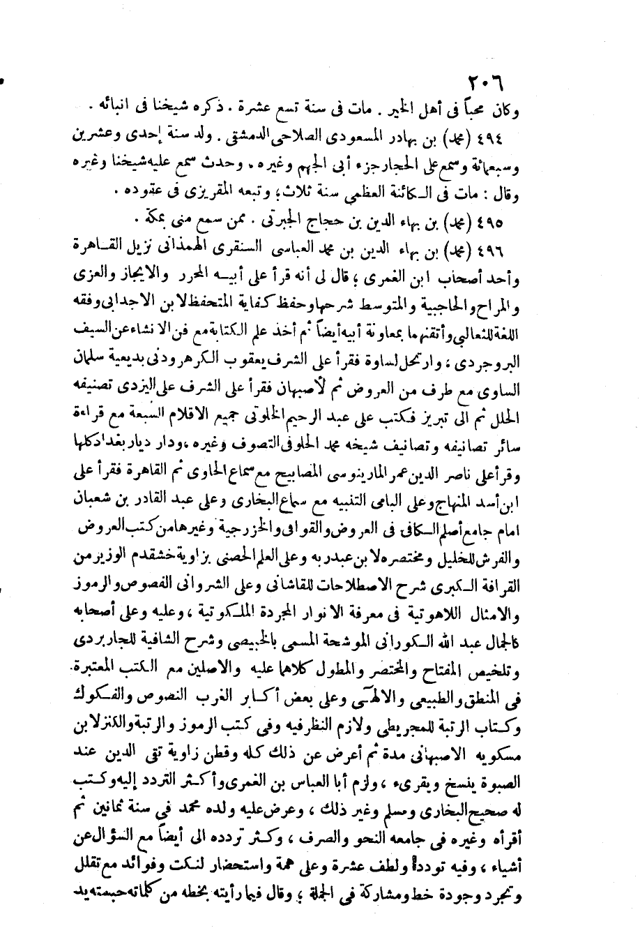 مُحَمَّد بن بهاء الدّين بن مُحَمَّد العباسي السنقري الهمذاني نزيل الْقَاهِرَة وَأحد أَصْحَاب ابْن الغمري قَالَ لي أَنه قَرَأَ على أَبِيه الْمُحَرر والايجاز والعزي والمراح الحاجبية والمتوسط وَشَرحهَا وَحفظ كِفَايَة المتحفظ لِابْنِ الاجدابي وَفقه اللُّغَة للثعالبي وأتقنهما بمعاونة أَبِيه ثمَّ أَخذ على م الْكِتَابَة مَعَ فن الانشاء عَن السَّيْف البروجردي، وارتحل لساوة فَقَرَأَ على الشّرف يَعْقُوب عَليّ اليزدي تصنيفه الْحلَل ثمَّ إِلَى تبريز فَكتب على عبد الرَّحِيم الخلوتي جَمِيع الأقلام السَّبْعَة مَعَ قِرَاءَة سَائِر تصانيفه وتصانيف شَيْخه مُحَمَّد الحلو فِي التصوف وَغَيره، وَدَار ديار بَغْدَاد كلهَا وَقَرَأَ على نَاصِر الدّين عمر المارينوسي المصابيح مَعَ سَماع الْحَاوِي ثمَّ الْقَاهِرَة فَقَرَأَ على ابْن أَسد الْمِنْهَاج وعَلى البامي التَّنْبِيه مَعَ سَماع البُخَارِيّ وعَلى عبد الْقَادِر بن شعْبَان أَمَام جَامع أصلم الْكَافِي فِي الْعرُوض والقوافي والخزرجية وَغَيرهَا من كتب الْعرُوض والفرش للخليل ومختصره لِابْنِ عبد ربه وعَلى الْعلم الحصني بزاوية خشقدم الْوَزير من القرافة الْكُبْرَى شرح الاصطلاحات للقشاني وعَلى الشرواني لفصوص والرموز والأمثال اللاهوتية فِي معرفَة الْأَنْوَار الْمُجَرَّدَة الملكوتية، وَعَلِيهِ وعَلى أَصْحَابه كالجمال عبد الله الكوراني الموشحة الْمُسَمّى بالخبيصي وَشرح الشافية لِجَار بردى وتلخيص الْمِفْتَاح والمختصر والمطول كِلَاهُمَا عَلَيْهِ والأصلين مَعَ الْكتب الْمُعْتَبرَة. فِي الْمنطق والطبيعي والألهي وَعلة بعض أكَابِر الغرب النُّصُوص والفكوك وَكتاب الرُّتْبَة للمجريطي ولازم النّظر فِيهِ وَفِي كتب الرموز والرتبة والكنز لِابْنِ مسكويه الاصبهاني مُدَّة ثمَّ أعرض عَن ذَلِك كُله وقطن زَاوِيَة تَقِيّ الدّين عِنْد الصبوة ينْسَخ ويقرئ، وَلزِمَ أَبَا الْعَبَّاس بن الغمري وَأكْثر التَّرَدُّد)