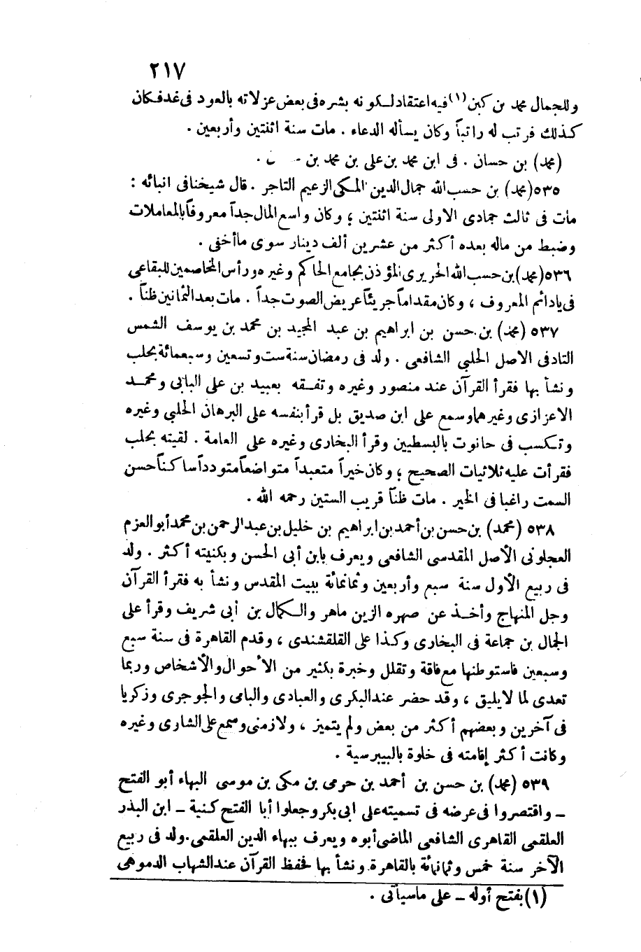 مُحَمَّد بن حسان. فِي ابْن مُحَمَّد بن عَليّ بن مُحَمَّد بن حُسَيْن. مُحَمَّد بن حسب الله جمال الدّين الْمَكِّيّ الزعيم التَّاجِر. قَالَ شَيخنَا فِي أنبائه: مَاتَ فِي ثَالِث جُمَادَى الأولى سنة اثْنَتَيْنِ وَكَانَ وَاسع المَال جدا مَعْرُوفا بالمعاملات وَضبط من مَاله بعده أَكثر من عشْرين ألف دِينَار سوى مَا أخْفى. مُحَمَّد بن حسب الله الحريري الْمُؤَذّن بِجَامِع الْحَاكِم وَغَيره وَرَأس المخاصمين للبقاعي فِي يَا دَائِم الْمَعْرُوف، وَكَانَ مقداما جريئا عريض الصَّوْت جدا. مَاتَ بعد الثَّمَانِينَ ظنا. مُحَمَّد بن حسن بن إِبْرَاهِيم بن عبد الْمجِيد بن مُحَمَّد بن يُوسُف الشَّمْس التاد فِي الأَصْل الْحلَبِي الشَّافِعِي. ولد فِي رَمَضَان سنة سِتّ وَتِسْعين وَسَبْعمائة بحلب ونشآ بهَا فَقَرَأَ الْقُرْآن عِنْد مَنْصُور وَغَيره وتفقه بعبيد بن عَليّ البابي وَمُحَمّد الأعزازي وَغَيرهمَا وَسمع على ابْن صديق بل قَرَأَ بِنَفسِهِ على الْبُرْهَان الْحلَبِي وَغَيره وتكسب فِي حَانُوت بالبسطيين وَقَرَأَ البُخَارِيّ وَغَيره على الْعَامَّة. لَقيته بحلب فَقَرَأت عَلَيْهِ ثلاثيات الصَّحِيح وَكَانَ خيرا متعبدا متواضعا متوددا سَاكِنا حسن السمت)