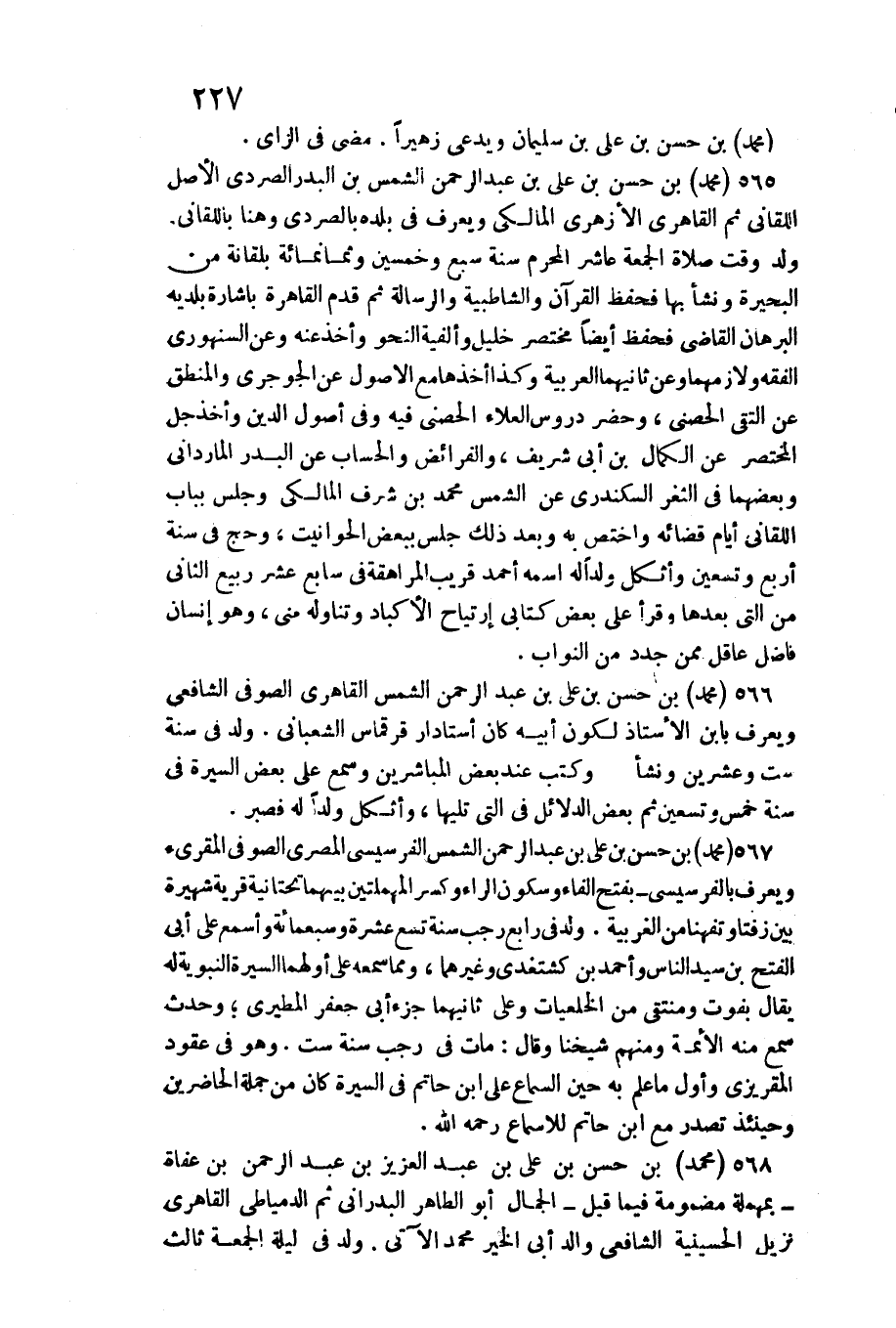 مُحَمَّد بن حسن بن عَليّ بن سُلَيْمَان ويدعى زهيرا. مضى فِي الزَّاي. مُحَمَّد بن حسن بن عَليّ بن عبد الرَّحْمَن الشَّمْس بن الْبَدْر الصردي الأَصْل اللَّقَّانِيّ ثمَّ القاهري الْأَزْهَرِي الْمَالِكِي وَيعرف فِي بَلَده بالصردي وَهنا باللقاني. ولد وَقت صَلَاة الْجُمُعَة عَاشر الْمحرم سنة سبع وَخمسين وَثَمَانمِائَة بلقانة من الْبحيرَة وَنَشَأ بهَا فحفظ الْقُرْآن والشاطبية والرسالة ثمَّ قدم الْقَاهِرَة بِإِشَارَة بلدية الْبُرْهَان القَاضِي فحفظ أَيْضا مُخْتَصر خَلِيل وألفية النَّحْو وَأخذ عَنهُ وَعَن السنهوري الْفِقْه ولازمهما وَعَن ثَانِيهمَا الْعَرَبيَّة وَكَذَا أَخذهَا مَعَ الْأُصُول عَن الْجَوْجَرِيّ والمنطق عَن التقي الحصني، وَحضر دروس الْعَلَاء الحصني فِيهِ وَفِي أصُول الدّين وَأخذ جلّ الْمُخْتَصر عَن الْكَمَال بن أبي شرِيف، والفرائض والحساب عَن الْبَدْر المارداني وبعضهما فِي الثغر السكندري عَن الشَّمْس مُحَمَّد بن شرف الْمَالِكِي وَجلسَ بِبَاب اللَّقَّانِيّ أَيَّام قَضَائِهِ واختص بِهِ وَبعد ذَلِك جلس بِبَعْض الحوانيت، وَحج فِي سنة أَربع وَتِسْعين وأثكل ولدا لَهُ اسْمه أَحْمد قريب المراهقة فِي سَابِع عشر ربيع الثَّانِي من الَّتِي بعْدهَا وَقَرَأَ على بعض كتابي إرتياح الأكباد وتناوله مني، وَهُوَ إِنْسَان فَاضل عَاقل مِمَّن جدد من النواب. مُحَمَّد بن حسن بن عَليّ بن عبد الرَّحْمَن الشَّمْس القاهري الصُّوفِي الشَّافِعِي وَيعرف بِابْن)