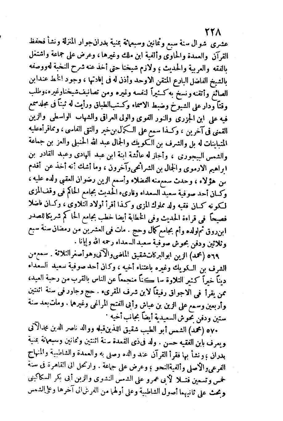وَأم بِجَامِع كَمَال وَحج. مَاتَ فِي الْعشْرين من رَمَضَان سنة سبع وَثَلَاثِينَ وَدفن بحوش صوفية سعيد السُّعَدَاء رَحمَه الله وإيانا. مُحَمَّد الزين أَبُو البركات شَقِيق الْمَاضِي والآتي وَهُوَ أَصْغَر الثَّلَاثَة. سمع من الشّرف بن الكويك وَغَيره باعتناء أَخِيه، وَكَانَ أحد صوفية سعيد السُّعَدَاء دينا خيرا كثير التِّلَاوَة سَاكِنا منجمعا عَن النَّاس بِالْقربِ من رحبة الْعِيد، مِمَّن يقْرَأ فِي الأجواق رَفِيقًا لِابْنِ شرف الْمُقْرِئ. حج وجاور فِي سنة اثْنَتَيْنِ وَأَرْبَعين وَسمع على الزين بن عَيَّاش وَأبي الْفَتْح المراغي وَغَيرهمَا. وَمَات بعد سنة سِتِّينَ وَدفن بحوش السعيدية أَيْضا بِجَانِب أَخِيه. مُحَمَّد الشَّمْس أَبُو الطّيب شَقِيق اللَّذين قبله ووالد نَاصِر الدّين مُحَمَّد الْآتِي وَيعرف بِابْن الْفَقِيه حسن. ولد فِي ذِي الْقعدَة سنة اثْنَتَيْنِ وَثَمَانِينَ وَسَبْعمائة بمنية بدران وَنَشَأ بهَا فَقَرَأَ الْقُرْآن عِنْد وَالِده وَصلى بِهِ والعمدة والشاطبية والمنهاج الفرعي والأصلي وألفية النَّحْو وَعرض على جمَاعَة.