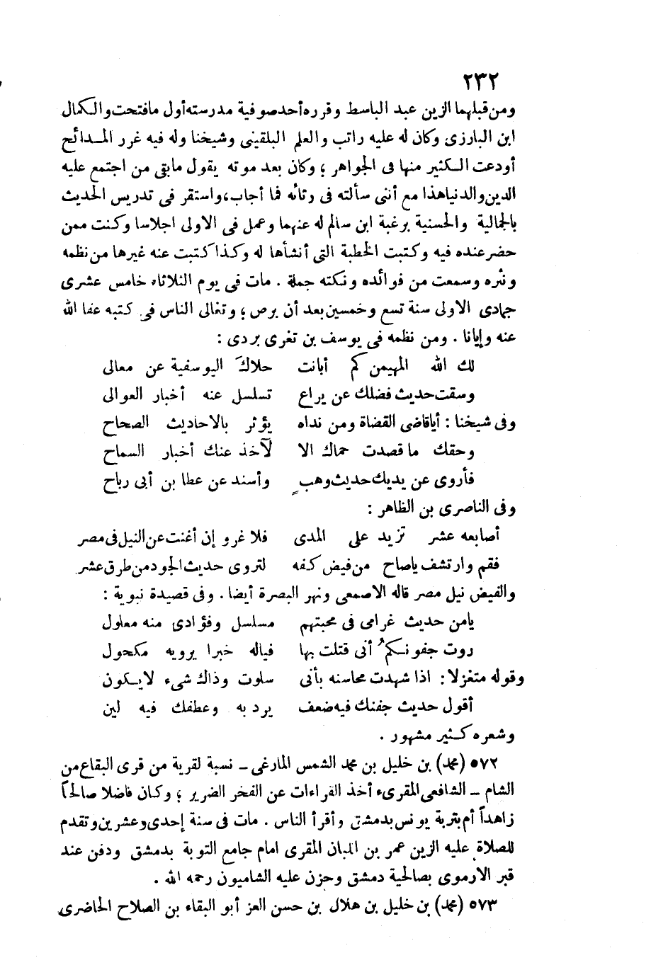 وشعره كثير مَشْهُور. مُحَمَّد بن خَلِيل بن مُحَمَّد الشَّمْس المارغي نِسْبَة لقرية من قرى الْبِقَاع من الشَّام الشَّافِعِي المقرىء أَخذ الْقرَاءَات عَن الْفَخر الضَّرِير وَكَانَ فَاضلا صَالحا زاهدا أم بتربة يُونُس بِدِمَشْق وأقرأ النَّاس. مَاتَ فِي سنة إِحْدَى وَعشْرين وَتقدم للصَّلَاة عَلَيْهِ الزين عمر بن المبان الْمقري إِمَام جَامع التَّوْبَة بِدِمَشْق وَدفن عِنْد قبر الأرموي بصالحية دمشق وحزن عَلَيْهِ الشاميون رَحمَه الله. مُحَمَّد بن خَلِيل بن هِلَال بن حسن الْعِزّ أَبُو الْبَقَاء بن الصّلاح الحاضري
