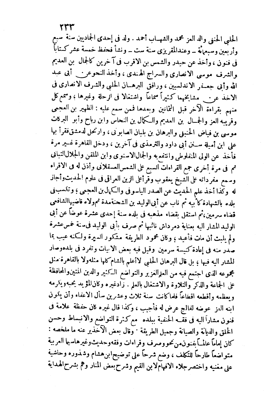 الْحلَبِي الْحَنَفِيّ وَالِد الْعِزّ مُحَمَّد والشهاب أَحْمد. ولد فِي إِحْدَى الجماديين سنة سبع وَأَرْبَعين وَسَبْعمائة وَعند المقريزي سنة سِتّ وَنَشَأ فحفظ خَمْسَة عشر كتابا فِي فنون، وَأخذ عَن حيدر وَالشَّمْس بن الْأَقْرَب فِي آخَرين كالجمال بن العديم والشرف مُوسَى الْأنْصَارِيّ والسراج الْهِنْدِيّ، وَأخذ النَّحْو عَن أبي عبد الله وَأبي جَعْفَر الأندلسيين، ورافق الْبُرْهَان الْحلَبِي والشرف الْأنْصَارِيّ فِي الْأَخْذ عَن مشايخهما كثيرا سَمَاعا واشتغالا فِي الرحلة وَغَيرهَا وَسمع كل مِنْهُم بِقِرَاءَة الآخر قبل الثَّمَانِينَ وَبعدهَا فَمِمَّنْ سمع عَلَيْهِ: الظهير بن العجمي وقريبه الْعِزّ وَالْجمال بن العديم والكمال بن النّحاس وَابْن رَبَاح وَأَبُو البركات مُوسَى بن فياض الْحَنْبَلِيّ والبرهان بن بلبان الصَّابُونِي، وارتحل لدمشق فَقَرَأَ بهَا على ابْن أميلة سنَن أبي دَاوُد وَالتِّرْمِذِيّ فِي آخَرين، وَدخل الْقَاهِرَة غير مرّة فَأخذ عَن الْوَلِيّ المنفلوطي وانتفع بِهِ وَالْجمال الأسنوي وَابْن الملقن والجلال التباني ثمَّ فِي مرّة أُخْرَى جمع الْقرَاءَات السَّبع على الشَّمْس الْعَسْقَلَانِي وَأذن لَهُ فِي الإقراء وَسمع مفرداته على الشَّيْخ يَعْقُوب وَقَرَأَ على الزين)