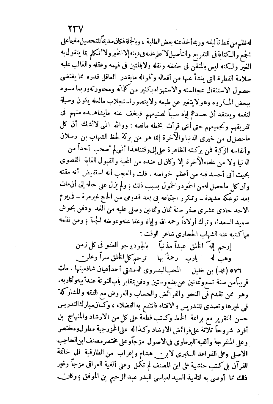 لَهُ نظم من نمط تأليفه وَرُبمَا أَخذ عَنهُ بعض الطّلبَة، وَبِالْجُمْلَةِ فَكَانَ مديما للتحصيل مُقيما على الْجمع وَالْكِتَابَة فِي التَّفْرِيع والتأصيل لَا أعلم عَلَيْهِ فِي دينه إِلَّا الْخَيْر وَلَا أَتكَلّم بِمَا يتقول بِهِ الْغَيْر وَلكنه لَيْسَ بالمتقن فِي حفظه وَنَقله وَلَا بالمتين فِي فهمه وعقله وَالْغَالِب عَلَيْهِ سَلامَة الْفطْرَة الَّتِي ينشأ عَنْهَا من أَفعاله وأقواله مَا يقدر الْعَاقِل قدره مِمَّا يَقْتَضِي حُصُول الاستثقال بمجالسته والاستهزاء بِكَثِير من كَلِمَاته ومحاورته وَرُبمَا مسوه بِبَعْض الْمَكْرُوه وَهُوَ لَا يتَغَيَّر عَن طبعه وَلَا يتَصَوَّر استجلاب مَا لَعَلَّه يكون وَسِيلَة لنفعه ويعتقد أَن حسدهم إِيَّاه سَببا لصنيعهم فيخف عَنهُ مَا يُشَاهِدهُ مِنْهُم فِي تفريقهم وتجميعهم حَتَّى أنني قَرَأت بِخَطِّهِ مَا نَصه: وَوَاللَّه إِنَّنِي لَا أَشك أَن كل مَا حصل لي من خيري الدُّنْيَا وَالْآخِرَة إِنَّمَا هُوَ من بركَة لحظ الشهَاب بن رسْلَان وأنفاسه الزكية فَمن بركته الظَّاهِرَة عَليّ إِلَى وقتنا هَذَا أنني لم أصحب أحدا من الدُّنْيَا وَلَا من عُلَمَاء الْآخِرَة إِلَّا وَكَانَ لي عِنْده من الْمحبَّة وَالْقَبُول الْغَايَة القصوى بِحَيْثُ أَنِّي أحسد فِيهِ من أعظم خواصه. قلت وَالْعجب أَنه استفيض أَنه مقته وَأَن كل مَا حصل لَهُ من الخمود والخمول بِسَبَب ذَلِك وَلم يزل على حَاله إِلَى أَن مَاتَ بعد توعكه مديدة وتكرر اجتماعه)