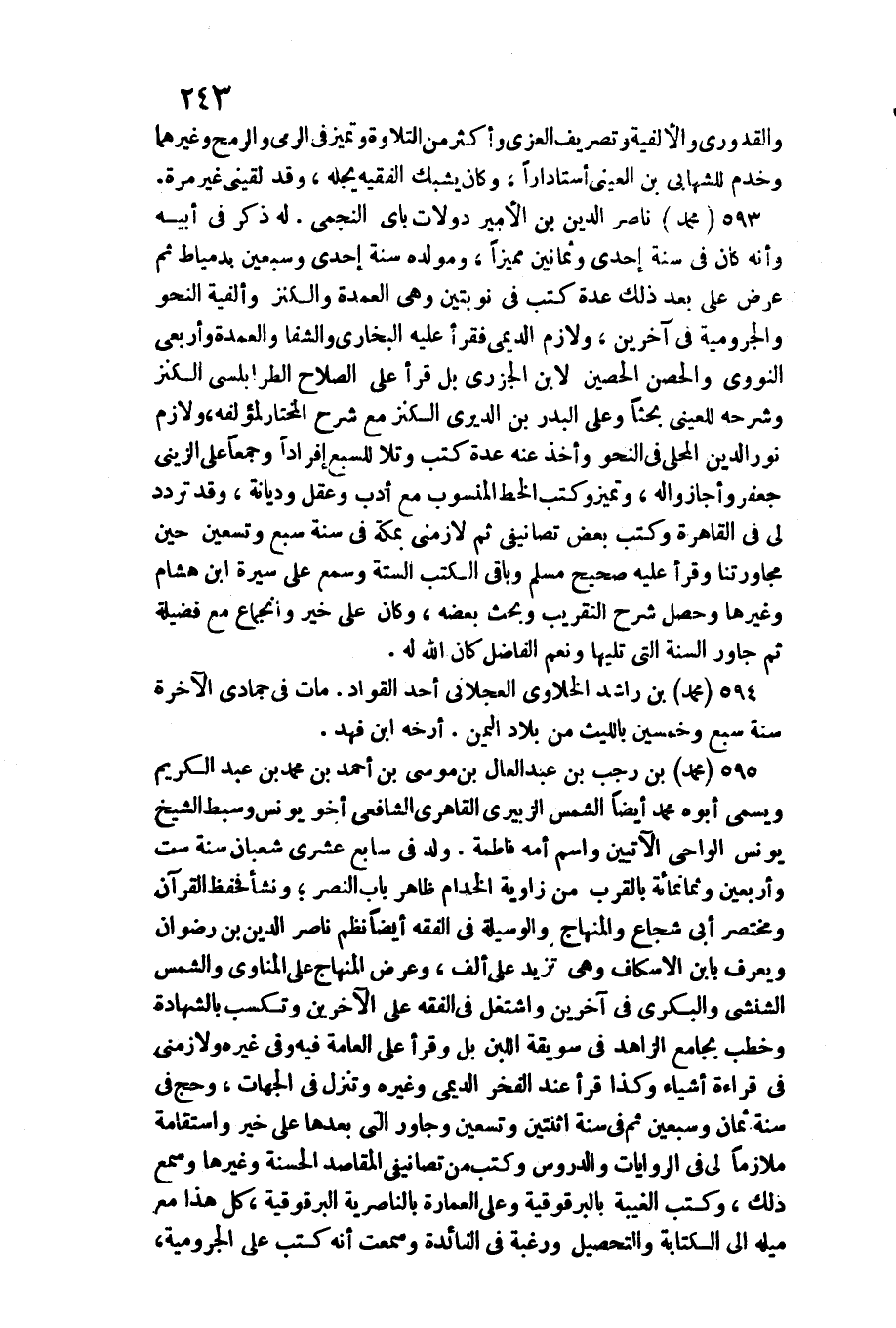 والقدوري والألفية وتصريف الْعزي وَأكْثر من التِّلَاوَة وتميز فِي الرَّمْي وَالرمْح وَغَيرهمَا وخدم للشهابي بن الْعَيْنِيّ أستادارا، وَكَانَ يشبك الْفَقِيه يجله، وَقد لَقِيَنِي غير مرّة. مُحَمَّد نَاصِر الدّين بن الْأَمِير دولات باي النجمي. لَهُ ذكر فِي أَبِيه وَأَنه كَانَ فِي سنة إِحْدَى وَثَمَانِينَ مُمَيّزا، ومولده سنة إِحْدَى وَسبعين بدمياط ثمَّ عرض عَليّ بعد ذَلِك عدَّة كتب فِي نوبتين وَهِي الْعُمْدَة والكنز وألفية النَّحْو والجرومية فِي آخَرين، ولازم الديمي فَقَرَأَ عَلَيْهِ البُخَارِيّ والشفا والعمدة وأربعي النَّوَوِيّ والحصن الْحصين لِابْنِ الْجَزرِي بل قَرَأَ على الصّلاح الطرابلسي الْكَنْز وَشَرحه للعيني بحثا وعَلى الْبَدْر بن الديري الْكَنْز مَعَ شرح الْمُخْتَار لمؤلفه، ولازم نور الدّين الْمحلي فِي النَّحْو وَأخذ عَنهُ عدَّة كتب وتلا للسبع إفرادا وجمعا على الزيني جَعْفَر وأجازوا لَهُ، وتميز وَكتب الْخط الْمَنْسُوب مَعَ أدب وعقل وديانة، وَقد تردد لي فِي الْقَاهِرَة وَكتب بعض تصانيفي ثمَّ لازمني بِمَكَّة فِي سنة سبع وَتِسْعين حِين مجاورتنا وَقَرَأَ عَلَيْهِ صَحِيح مُسلم وَبَاقِي الْكتب السِّتَّة وَسمع على سيرة ابْن هِشَام وَغَيرهَا وَحصل شرح التَّقْرِيب وَبحث بعضه، وَكَانَ على خير)