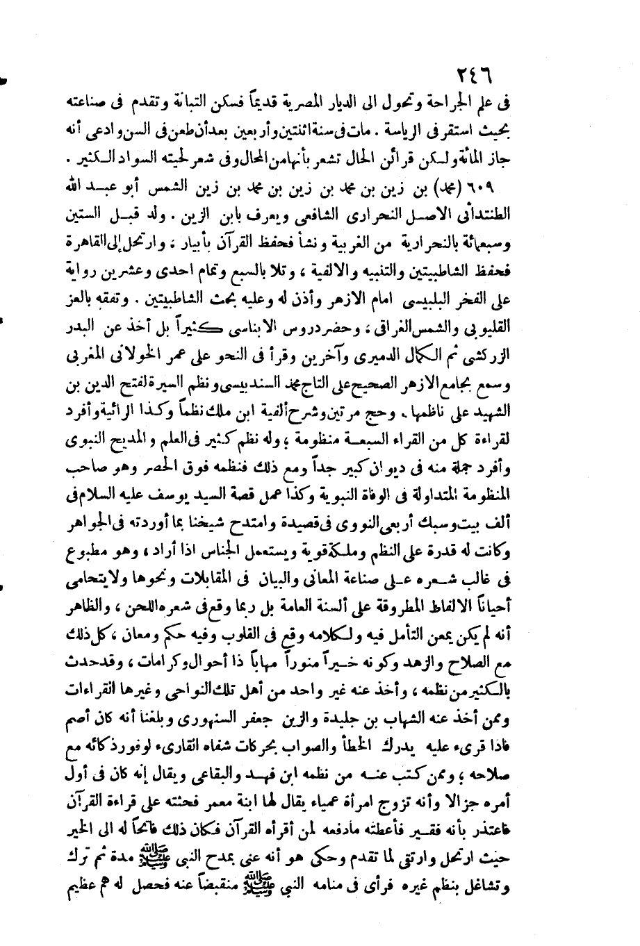 فِي علم الْجراحَة وتحول إِلَى الديار المصرية قَدِيما فسكن التبانة وَتقدم فِي صناعته بِحَيْثُ اسْتَقر فِي الرياسة. مَاتَ فِي سنة اثْنَتَيْنِ وَأَرْبَعين بعد أَن طعن فِي السن وَادّعى أَنه جَازَ الْمِائَة وَلَكِن قَرَائِن الْحَال تشعر بِأَنَّهَا من الْمحَال وَفِي شعر لحيته السوَاد الْكثير. مُحَمَّد بن زين بن مُحَمَّد بن زين بن مُحَمَّد بن زين الشَّمْس أَبُو عبد الله الطنتدائي الأَصْل النحراري الشَّافِعِي وَيعرف بِابْن الزين. ولد قبل السِّتين وَسَبْعمائة بالنحرارية من الغربية وَنَشَأ فحفظ الْقُرْآن بأبيار، وارتحل إِلَى الْقَاهِرَة فحفظ الشاطبيتين والتنبيه والألفية، وتلا بالسبع وَتَمام إِحْدَى وَعشْرين رِوَايَة على الْفَخر البلبيسي إِمَام الْأَزْهَر وَأذن لَهُ وَعَلِيهِ بحث الشاطبيتين. وتفقه بالعز القليوبي وَالشَّمْس الغراقي، وَحضر دروس الأبناسي كثيرا بل أَخذ عَن الْبَدْر الزَّرْكَشِيّ ثمَّ الْكَمَال الدَّمِيرِيّ وَآخَرين وَقَرَأَ فِي النَّحْو على عمر الْخَولَانِيّ المغربي وَسمع بِجَامِع الْأَزْهَر)
