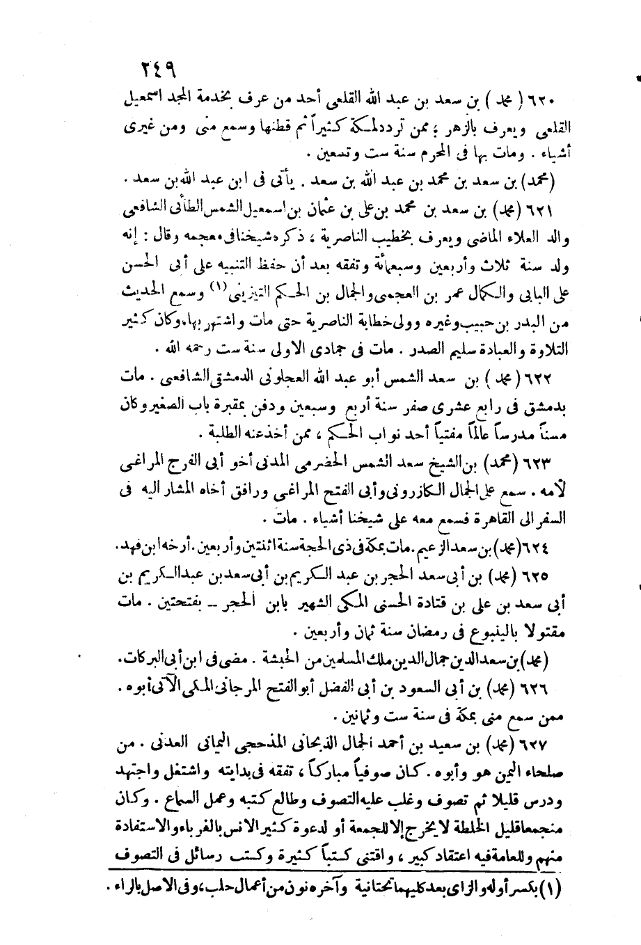 وَسَبْعمائة وتفقه بعد أَن حفظ التَّنْبِيه على أبي الْحسن عَليّ البابي والكمال عمر بن العجمي وَالْجمال بن الحكم التيزيني وَسمع الحَدِيث من الْبَدْر بن حبيب وَغَيره وَولي خطابة الناصرية حَتَّى مَاتَ واشتهر بهَا، وَكَانَ كثير التِّلَاوَة وَالْعِبَادَة سليم الصَّدْر. مَاتَ فِي جُمَادَى الأولى سنة سِتّ رَحمَه الله. مُحَمَّد بن سعد الشَّمْس أَبُو عبد الله العجلوني الدِّمَشْقِي الشَّافِعِي. مَاتَ بِدِمَشْق فِي رَابِع عشري صفر سنة أَربع وَسبعين وَدفن بمقبرة بَاب الصَّغِير وَكَانَ مسنا مدرسا عَالما مفتيا أحد نواب الحكم، مِمَّن أَخذ عَنهُ الطّلبَة. مُحَمَّد بن الشَّيْخ سعد الشَّمْس الْحَضْرَمِيّ الْمدنِي أَخُو أبي الْفرج المراغي لأمه، سمع على الْجمال الكازروني وَأبي الْفَتْح المراغي ورافق أَخَاهُ الْمشَار إِلَيْهِ فِي السّفر إِلَى الْقَاهِرَة فَسمع مَعَه على شَيخنَا أَشْيَاء. مَاتَ. مُحَمَّد بن سعد الزعيم. مَاتَ بِمَكَّة فِي ذِي الْحجَّة سنة اثْنَتَيْنِ وَأَرْبَعين. أرخه ابْن فَهد. مُحَمَّد بن أبي سعد الْحجر بن عبد الْكَرِيم بن أبي سعد بن عبد الْكَرِيم بن أبي سعد بن عَليّ بن قَتَادَة الحسني الْمَكِّيّ الشهير بِابْن الْحجر بِفتْحَتَيْنِ. مَاتَ مقتولا بالينبوع فِي رَمَضَان سنة ثَمَان وَأَرْبَعين.