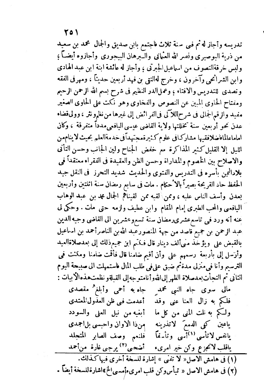 والرقم الجمالي فِي شرح اللآلي فِي الْفَرَائِض إِلَى غَيرهَا من نظم ونثر، وَولي قَضَاء عدن نَحْو أَرْبَعِينَ سنة تخللتها ولَايَة القَاضِي عِيسَى اليافعي مدَدا مُتَفَرِّقَة، وَكَانَ إِمَامًا عَالما فَاضلا فَقِيها مشاركا فِي عُلُوم كَثِيرَة مُجْتَهدا فِي خدمَة الْعلم بِحَيْثُ لَا ينَام من اللَّيْل إِلَّا الْقَلِيل كثير المذاكرة مَعَ خفض الْجنَاح ولين الْجَانِب وَحسن التأني والإصلاح بَين الْخُصُوم والمداراة وَحسن الظَّن والعقيدة فِي الْفُقَرَاء مُعْتَقدًا فِي بِلَاد الْيمن بأسره فِي التدريس وَالْفَتْوَى والْحَدِيث شَدِيد التَّحَرُّز فِي النَّقْل جيد الْحِفْظ حاد القريحة بَصيرًا بِالْأَحْكَامِ. مَاتَ فِي سَابِع رَمَضَان سنة اثْنَتَيْنِ وَأَرْبَعين بعدن وأسف النَّاس عَلَيْهِ، وَمِمَّنْ لقِيه مِمَّن لَقِينَاهُمْ الْجمال مُحَمَّد بن عبد الْوَهَّاب اليافعي والمحب الطَّبَرِيّ إِمَام المقامي وَابْن عطيف وَلَزِمَه حَتَّى مَاتَ. وَحكى لي عَنهُ أَنه ورد فِي تَاسِع عشري رَمَضَان سنة تسع وَعشْرين إِلَى القَاضِي وجيه الدّين عبد الرَّحْمَن بن جَمِيع قَاصد من جِهَة الْمَنْصُور عبد الله بن النَّاصِر أَحْمد بن إِسْمَاعِيل بِالْقَبْضِ عَليّ وَيُؤْخَذ مني ألف دِينَار قَالَ فكتم ابْن جَمِيع ذَلِك إِلَى بعد صَلَاة الْعِيد وَأرْسل إِلَيّ بأَرْبعَة رسمهم عَليّ وَأَن أقيم ضَامِنا قَالَ فأقمت ضَامِنا ومكنت فِي الترسيم وَأَنا فِي منزلي مُدَّة ثمَّ ضيق عَليّ فِي طلب المَال فاستمهلت إِلَى صَبِيحَة الْيَوْم الثَّانِي ثمَّ التجأت بعد صَلَاة الظّهْر إِلَى الله وَأَنا مُتَوَجّه إِلَى الْقبْلَة ونظمت هَذِه الأبيات: