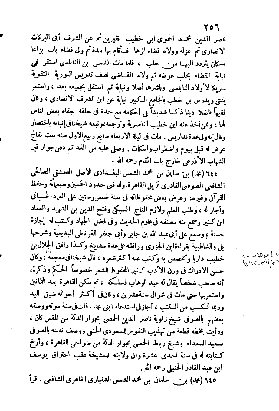 فِي إنبائه بِاخْتِصَار وَقَالَ إِنَّه ولي عدَّة تداريس. مَاتَ فِي لَيْلَة الْأَرْبَعَاء سَابِع ربيع الأول سنة سِتّ بفالج عرض لَهُ قبل بِيَوْم واضطراب وإسكات. وَصلي عَلَيْهِ من الْغَد ثمَّ دفن جوَار قبر الشهَاب الْأَذْرَعِيّ خَارج بَاب الْمقَام رَحمَه الله. مُحَمَّد بن سلمَان بن مُحَمَّد الشَّمْس الْبَغْدَادِيّ الأَصْل الدِّمَشْقِي الصَّالِحِي الشَّافِعِي الصُّوفِي القادري نزيل الْقَاهِرَة. ولد فِي حُدُود الْخمسين وَسَبْعمائة وَحفظ الْقُرْآن وَغَيره، وَعرض بعض محفوظاته فِي سنة خمس وَسِتِّينَ على الْعِمَاد الحسباني وَأَجَازَ لَهُ، وَطلب الْعلم ولازم التَّاج السُّبْكِيّ وَفتح الدّين بن الشَّهِيد والعماد ابْن كثير وَسمع مِنْهُ مُصَنفه فِي عُلُوم الحَدِيث وَفِي فضل الْجِهَاد وَكتب لَهُ إجَازَة حَسَنَة وَسمع على أبي عبد الله بن جَابر وَأبي جَعْفَر الغرناطي البديعية وَشَرحهَا بل والشاطبية بِقِرَاءَة ابْن الْجَزرِي ورافقه على عدَّة مَشَايِخ وَكَذَا رافق الْجلَال بن خطيب داريا وتخصص بِهِ وَكتب عَنهُ أَكثر شعره، قَالَ شَيخنَا فِي مُعْجَمه: وَكَانَ حسن الأدراك فِي وزن الْأَدَب كثير الْمَحْفُوظ للشعر خُصُوصا الحكم وَذكر لي أَنه صحب شخصا يُقَال لَهُ عبد الْوَهَّاب فسلكه، ثمَّ سكن الْقَاهِرَة بعد الثَّمَانِينَ وَاسْتمرّ بهَا حَتَّى مَاتَ فِي شَوَّال سنة عشْرين، وَكَانَ فِي أَكثر أَحْوَاله ضيق الْيَد وَرُبمَا تكسب من الْكتب، أجَاز فِي استدعاء ابْني مُحَمَّد. قلت فِي سنة مَوته وَوَصفه بَعضهم بالصوفي شيخ زَاوِيَة نَاصِر الدّين الْحِمصِي بجوار الدكة من المقس كَانَ، وَرَأَيْت بِخَطِّهِ قِطْعَة من تَهْذِيب النُّفُوس للسعودي الْحَنَفِيّ وَوصف نَفسه بالصوفي بِسَعِيد السُّعَدَاء وَشَيخ رِبَاط الْحِمصِي بجوار الدكة من ضواحي الْقَاهِرَة، وأرخ كِتَابَته لَهُ فِي سنة إِحْدَى عشرَة وَإِن ولَايَته للمشيخة عقب احتراق يُوسُف ابْن عبد الْقَادِر الْحَنْبَلِيّ رَحمَه الله. مُحَمَّد بن سلمَان بن مُحَمَّد الشَّمْس الشنباري القاهري الشَّافِعِي. قَرَأَ