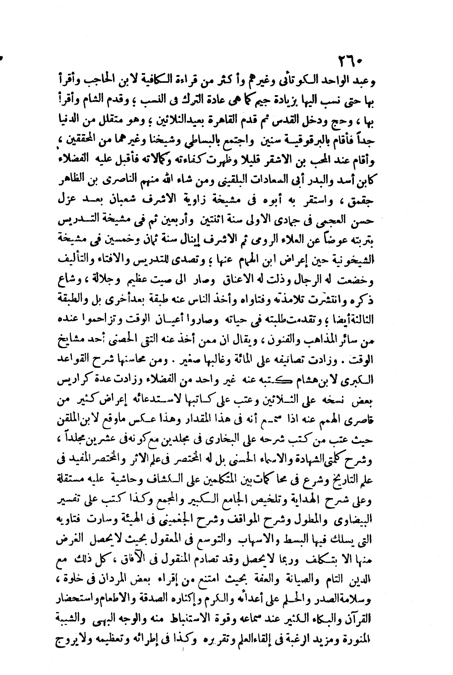 وَعبد الْوَاحِد الكوتائي وَغَيرهم وَأكْثر من قِرَاءَة الكافية لِابْنِ الْحَاجِب وأقرأ بهَا حَتَّى نسب إِلَيْهَا بِزِيَادَة جِيم كَمَا هِيَ عَادَة التّرْك فِي النّسَب وَقدم الشَّام وأقرأ بهَا، وَحج وَدخل الْقُدس ثمَّ قدم الْقَاهِرَة بعيد الثَّلَاثِينَ وَهُوَ متقلل من الدُّنْيَا جدا فَأَقَامَ بالبرقوقية سِنِين وَاجْتمعَ بالبساطي وَشَيخنَا وَغَيرهمَا من الْمُحَقِّقين، وَأقَام عِنْد الْمُحب بن الْأَشْقَر قَلِيلا وَظَهَرت كفاءته وكمالاته فَأقبل عَلَيْهِ الْفُضَلَاء كَابْن أَسد والبدر أبي السعادات البُلْقِينِيّ وَمن شَاءَ الله مِنْهُم الناصري بن الظَّاهِر جقمق، وَاسْتقر بِهِ أَبوهُ فِي مشيخة زَاوِيَة الْأَشْرَف شعْبَان بعد عزل حسن العجمي فِي جُمَادَى الأولى سنة اثْنَتَيْنِ وَأَرْبَعين ثمَّ فِي مشيخة التدريس بتربته عوضا عَن الْعَلَاء الرُّومِي ثمَّ الْأَشْرَف إينال سنة ثَمَان وَخمسين فِي مشيخة الشيخونية حِين إِعْرَاض ابْن الْهمام عَنْهَا وتصدى)