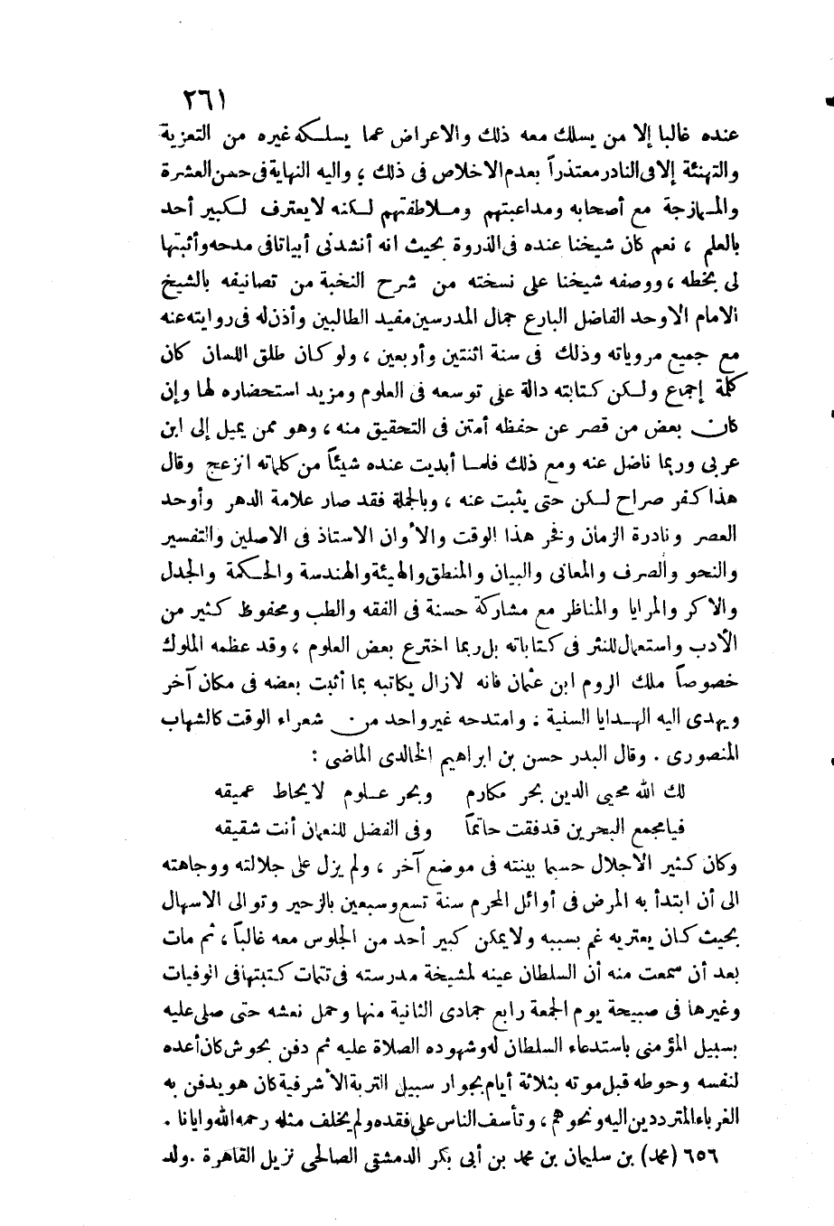 وَكَانَ كثير الإجلال حَسْبَمَا بَينته فِي مَوضِع آخر، وَلم يزل على جلالته ووجاهته إِلَى أَن ابْتَدَأَ بِهِ الْمَرَض فِي أَوَائِل الْمحرم سنة تسع وَسبعين بالزحير وتوالي الإسهال بِحَيْثُ كَانَ يَعْتَرِيه غم بِسَبَبِهِ وَلَا يُمكن كَبِير أحد من الْجُلُوس مَعَه غَالِبا، ثمَّ مَاتَ بعد أَن سَمِعت مِنْهُ أَن السُّلْطَان عينه لمشيخة مدرسته فِي تتمات كتبتها فِي الوفيات وَغَيرهَا فِي صَبِيحَة يَوْم الْجُمُعَة رَابِع جُمَادَى الثَّانِيَة مِنْهَا وَحمل نعشه حَتَّى صلى عَلَيْهِ بسبيل المؤمني باستدعاء السُّلْطَان لَهُ وشهوده الصَّلَاة عَلَيْهِ ثمَّ دفن بحوش كَانَ أعده لنَفسِهِ وحوطه قبل مَوته بِثَلَاثَة أَيَّام بجوار سَبِيل التربة الأشرفية كَانَ هُوَ يدْفن بِهِ الغرباء المترددين إِلَيْهِ وَنَحْوهم، وتأسف النَّاس على فَقده وَلم يخلف مثله رَحمَه الله وإيانا. مُحَمَّد بن سُلَيْمَان بن مُحَمَّد بن أبي بكر الدِّمَشْقِي الصَّالِحِي نزيل الْقَاهِرَة. ولد
