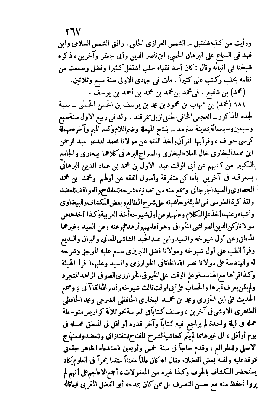 مُحَمَّد بن شَفِيع. فِي مُحَمَّد بن مُحَمَّد بن مُحَمَّد بن أَحْمد بن يُوسُف. مُحَمَّد بن شهَاب بن مَحْمُود بن مُحَمَّد بن يُوسُف بن الْحسن الحسني نِسْبَة لجده الْمَذْكُور العجمي الخافي الْحَنَفِيّ نزيل سَمَرْقَنْد. ولدف ي ربيع الأول سنة سبع وَسبعين وَسَبْعمائة بِمَدِينَة سلومد بِفَتْح الْمُهْملَة وَضم اللَّام وَكسر الْمِيم وَآخره مُهْملَة كرْسِي خواف، وَقَرَأَ بهَا الْقُرْآن وَأخذ الْفِقْه عَن مَوْلَانَا مُحَمَّد الْمَدْعُو عبد الرَّحْمَن بن مُحَمَّد البُخَارِيّ خَال الْعَلَاء البُخَارِيّ والسراج البرهاني كِلَاهُمَا ببخارى وَالْجَامِع الْكَبِير من كتبهمْ عَن أبي الْوَقْت عبد الأول بن مُحَمَّد بن عماد الدّين البرهاني بسمرقند فِي آخَرين بأماكن مُتَفَرِّقَة وأصول الْفِقْه عَن أَوَّلهمْ وَمُحَمّد بن مُحَمَّد الحصاري وَالسَّيِّد الْجِرْجَانِيّ وَسمع مِنْهُ من تصانيفه شَرحه للمفتاح وللمواقف للعضد ولتذكرة الطوسي فِي الْهَيْئَة وحاشيته على شرح الْمطَالع وَبَعض الْكَشَّاف والبيضاوي وَأَشْيَاء وعنهما أَخذ علم الْكَلَام وعنهما وَعَن أول شُيُوخه أَخذ الْعَرَبيَّة وَكَذَا أَخذهَا عَن مَوْلَانَا ركن الدّين الطواشي الخوافي وَهُوَ أعلمهم وأزهدهم وَعنهُ وَعَن السَّيِّد وَغَيرهمَا الْمنطق وَعَن أول شُيُوخه وَالسَّيِّد وَابْن عبد الحميد الشَّاشِي الْمعَانِي وَالْبَيَان والبديع وَقَرَأَ الطِّبّ على أول شُيُوخه ومولانا فضل التبريزي سمع عَلَيْهِ الموجز وَشَرحه لَهُ والهندسة على مَوْلَانَا نصر الله الخاقاني الْخَوَارِزْمِيّ وَالسَّيِّد وَعَلَيْهِمَا قَرَأَ الْهَيْئَة وَكَذَا قَرَأَهَا مَعَ الهندسة وَعلم الْوَقْت على الخيوقي الْخَوَارِزْمِيّ الصُّوفِي الزَّاهِد المتجرد وَلم يكن يعرف غَيرهَا والحساب على أبي الْوَقْت ثَالِث شُيُوخه وَنصر الله القاآني وَسمع الحَدِيث على ابْن الْجَزرِي وَمُحَمّد بن مُحَمَّد البُخَارِيّ الحافظي الشعري وَمُحَمّد الحافظي الطاهري الأوشى فِي آخَرين، وصنف كتابا فِي الْعَرَبيَّة نَحْو ثَلَاثَة كراريس متوسطة عمله فِي لَيْلَة وَاحِدَة لم يُرَاجع فِيهِ كتابا وَآخر قدره أَو أقل فِي الْمنطق عمله فِي يَوْم أَو أقل، إِلَى غَيرهَا مِمَّا لم يتم كحاشية لشرح الْمِفْتَاح للتفتازاني وللعضد وللمنهاج الْأَصْلِيّ وللطوالع، وَقدم حَاجا فِي سنة خمس وَأَرْبَعين فاستدعاه الظَّاهِر جقمق فوفد عَلَيْهِ ولقيه بعض الْفُضَلَاء فَقَالَ إِنَّه كَانَ عَالما مفننا متقنا بحرا فِي الْعُلُوم يكَاد يستحضر الْكَشَّاف بالحرف وَكَذَا غَيره من المعقولات، أجمع الْأَعَاجِم على أَنهم لم يرَوا)