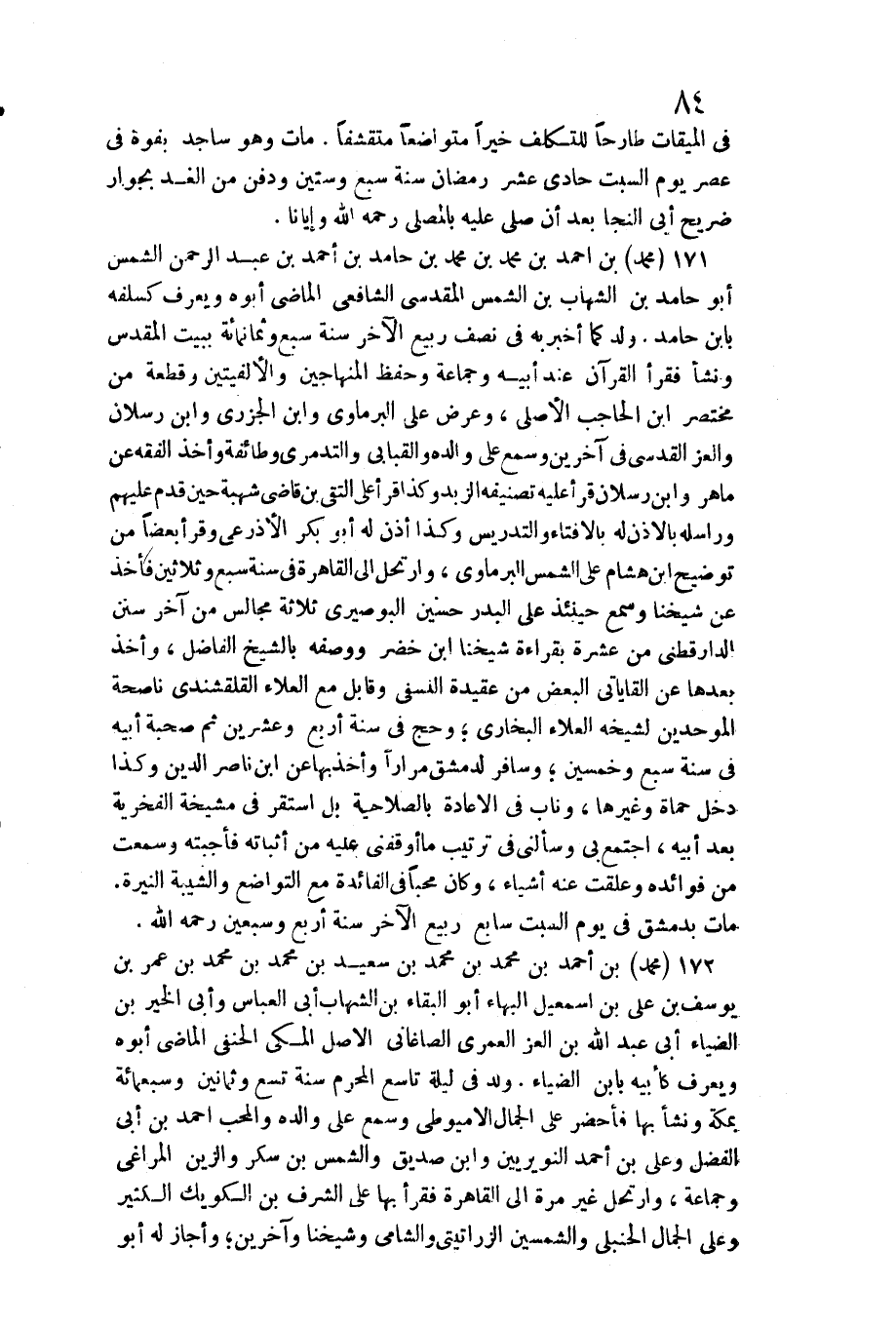 مُحَمَّد بن أَحْمد بن مُحَمَّد بن مُحَمَّد بن حَامِد بن أَحْمد بن عبد الرَّحْمَن الشَّمْس أَبُو حَامِد بن الشهَاب بن الشَّمْس الْمَقْدِسِي الشَّافِعِي الْمَاضِي أَبوهُ وَيعرف كسلفه بِابْن حَامِد. ولد كَمَا أخبر بِهِ فِي نصف ربيع الآخر سنة سبع وَثَمَانمِائَة بِبَيْت الْمُقَدّس وَنَشَأ فَقَرَأَ الْقُرْآن عِنْد أَبِيه وَجَمَاعَة وَحفظ المنهاجين والألفيتين وَقطعَة من مُخْتَصر ابْن الْحَاجِب الْأَصْلِيّ، وَعرض على الْبرمَاوِيّ وَابْن الْجَزرِي وَابْن رسْلَان والعز الْقُدسِي فِي آخَرين وَسمع على وَالِده القباني والتدمري وَطَائِفَة وَأخذ الْفِقْه عَن ماهر وَابْن رسْلَان قَرَأَ عَلَيْهِ تصنيفه الزّبد وَكَذَا قَرَأَ على التقي بن قَاضِي شُهْبَة حِين قدم عَلَيْهِم وراسله بالاذن لَهُ بالافتاء والتدريس وَكَذَا أذن لَهُ أَبُو بكر الْأَذْرَعِيّ وَقَرَأَ بَعْضًا من توضيح ابْن هِشَام على الشَّمْس الْبرمَاوِيّ، وارتحل إِلَى)