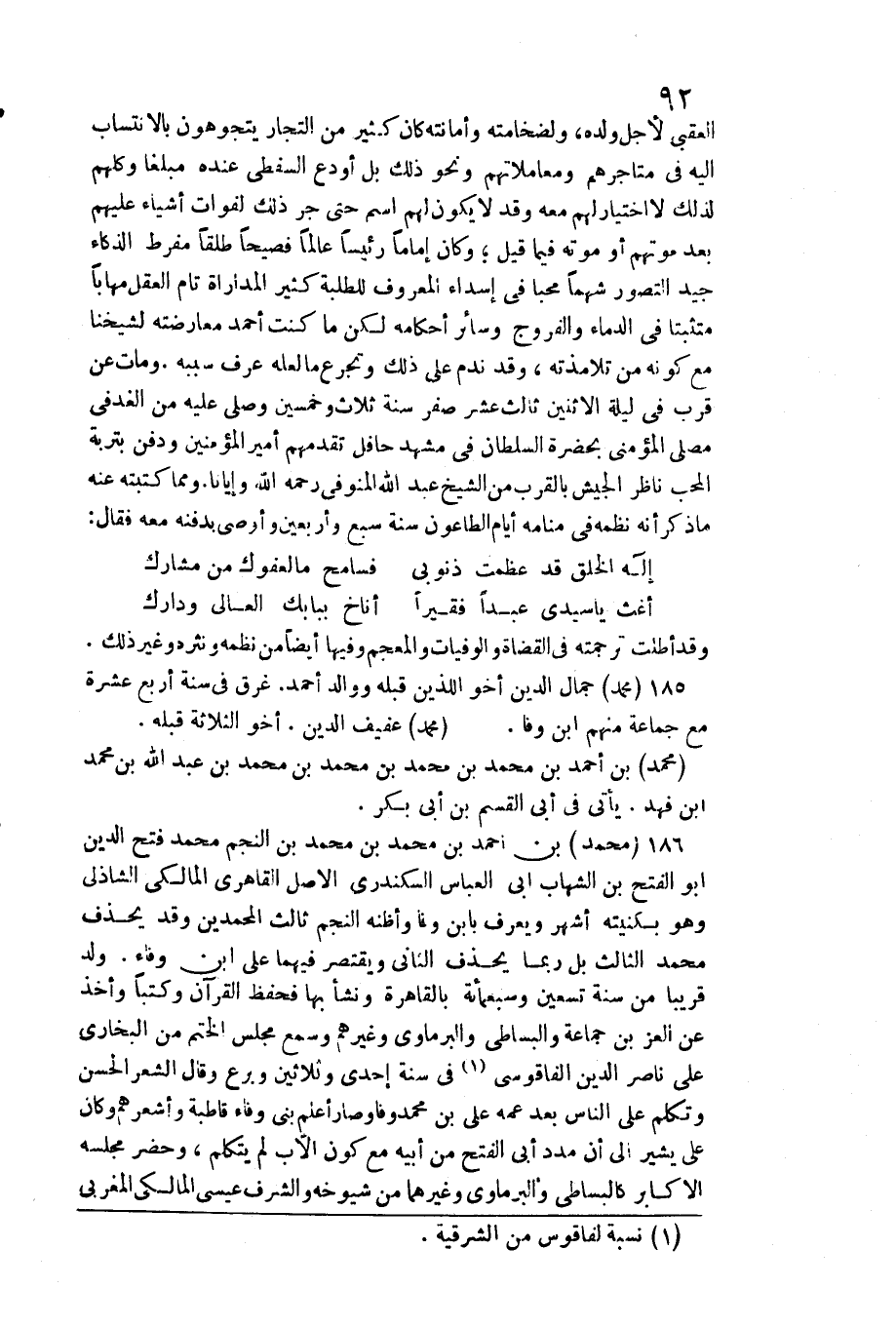التُّجَّار يتجوهون بالأنتساب إِلَيْهِ فِي متاجرهم ومعاملاتهم وَنَحْو ذَلِك بل أودع السفطي عِنْده مبلغا وَكلهمْ لذَلِك لَا أختيار لَهُم مَعَه وَقد لَا يكون لَهُم اسْم حَتَّى جر ذَلِك لفَوَات أَشْيَاء عَلَيْهِم بعد مَوْتهمْ أَو مَوته فِيمَا قيل وَكَانَ إِمَامًا رئيساعالما فصيحا طلقا مفرط الذكاء جيد التَّصَوُّر شهما محبا فِي إسداء الْمَعْرُوف للطلبة كثير المدارة تَامّ الْعقل مهابا متثبتا فِي الدِّمَاء والفروج وَسَائِر أَحْكَامه لَكِن مَا كنت أَحْمد معارضته لشَيْخِنَا مَعَ كَونه من تلامذته، وَقد نَدم على ذَلِك وتجرع مَا لَعَلَّه عرف سَببه. وَمَات عَن قرب فِي لَيْلَة الِاثْنَيْنِ ثَالِث عشر صفر سنة ثَلَاث وَخمسين وَصلى عَلَيْهِ من الغدفى مصلى المؤمنى بِحَضْرَة السُّلْطَان فِي مشْهد حافل تقدمهم أَمِير الْمُؤمنِينَ وَدفن بتربة الْمُحب نَاظر الْجَيْش بِالْقربِ من الشَّيْخ عبد الله المنوفي رَحمَه الله وإيانا. وَمِمَّا كتبته عَنهُ مَا ذكر أَنه نظمه فِي مَنَامه أَيَّام الطَّاعُون سنة سبع وَأَرْبَعين وَأوصى بدفنه مَعَه فَقَالَ: