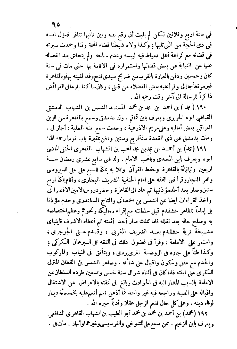 الْإِمَامَة، وَقَرَأَ فِي غُضُون ذَلِك فِي الْفِقْه على الْبُرْهَان الكركي وَكَذَا ظنا على جَاره فِي الرَّوْضَة تغرى بردى، ويتأنق فِي الثِّيَاب والمركوب والخدم مَعَ عقل وَسُكُون وإقبال على شَأْنه. وصاهر الشَّمْس بن السطان المنزلي السكرِي على ابْنَته فَلَمَّا كَانَ أثْنَاء شَوَّال سنة خمس وَتِسْعين طرده بن السطان عَن الْإِمَامَة بِالسَّبَبِ الْمشَار إِلَيْهِ فِي الْحَوَادِث وَبَالغ فِي تمقته بالأعراض عَن الِاشْتِغَال وإقباله على الصَّيْد وراجعه فِيهِ غير وَاحِد فَمَا أذعن نعم أنعم عَلَيْهِ بِخَمْسِمِائَة دِينَار لوفاء دينه. وعَلى كل حَال فَنعم الرجل عقلا وأدبا جبره الله.
