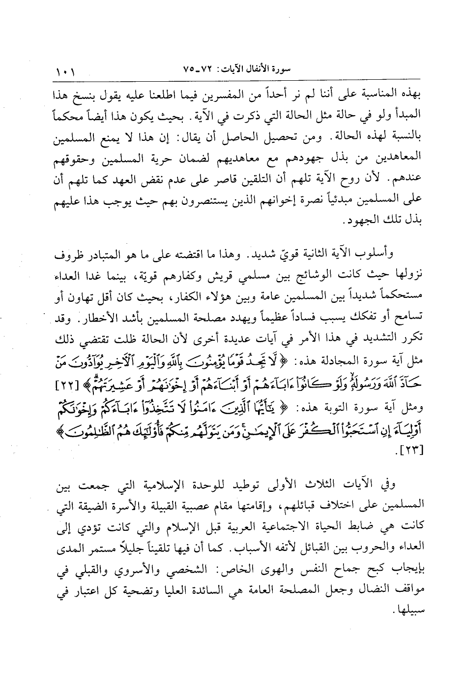 بهذه المناسبة على أننا لم نر أحدا من المفسرين فيما اطلعنا عليه يقول بنسخ هذا المبدأ ولو في حالة مثل الحالة التي ذكرت في الآية. بحيث يكون هذا أيضا محكما بالنسبة لهذه الحالة. ومن تحصيل الحاصل أن يقال: إن هذا لا يمنع المسلمين المعاهدين من بذل جهودهم مع معاهديهم لضمان حرية المسلمين وحقوقهم عندهم. لأن روح الآية تلهم أن التلقين قاصر على عدم نقض العهد كما تلهم أن على المسلمين مبدئيا نصرة إخوانهم الذين يستنصرون بهم حيث يوجب هذا عليهم بذل تلك الجهود.