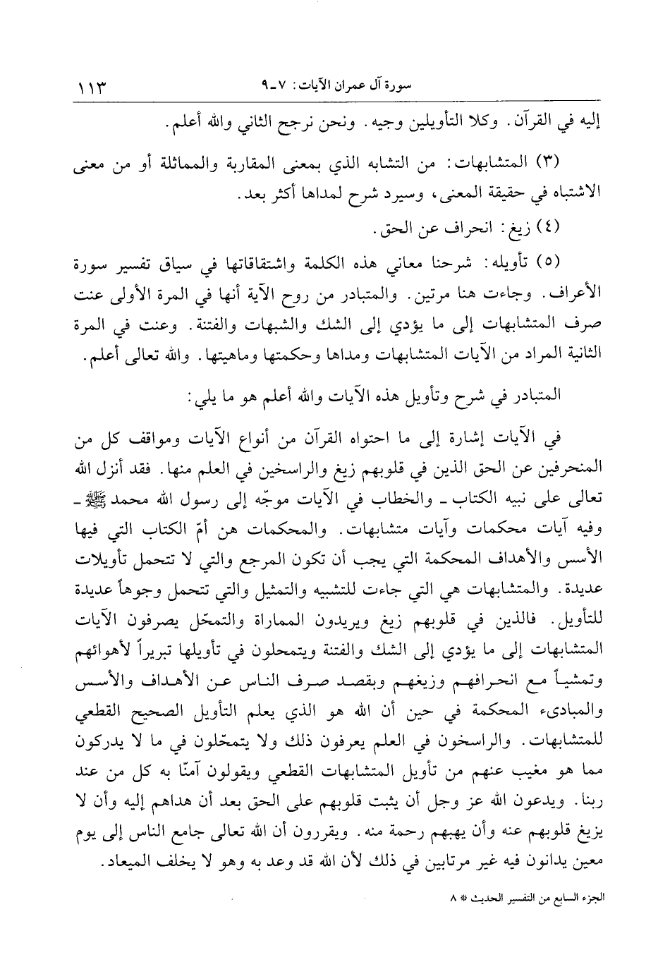 في الآيات إشارة إلى ما احتواه القرآن من أنواع الآيات ومواقف كل من المنحرفين عن الحق الذين في قلوبهم زيغ والراسخين في العلم منها. فقد أنزل الله تعالى على نبيه الكتاب- والخطاب في الآيات موجّه إلى رسول الله محمد صلى الله عليه وسلم- وفيه آيات محكمات وآيات متشابهات. والمحكمات هن أمّ الكتاب التي فيها الأسس والأهداف المحكمة التي يجب أن تكون المرجع والتي لا تتحمل تأويلات عديدة. والمتشابهات هي التي جاءت للتشبيه والتمثيل والتي تتحمل وجوها عديدة للتأويل. فالذين في قلوبهم زيغ ويريدون المماراة والتمحّل يصرفون الآيات المتشابهات إلى ما يؤدي إلى الشك والفتنة ويتمحلون في تأويلها تبريرا لأهوائهم وتمشيا مع انحرافهم وزيغهم وبقصد صرف الناس عن الأهداف والأسس والمبادئ المحكمة في حين أن الله هو الذي يعلم التأويل الصحيح القطعي للمتشابهات. والراسخون في العلم يعرفون ذلك ولا يتمحّلون في ما لا يدركون مما هو مغيب عنهم من تأويل المتشابهات القطعي ويقولون آمنّا به كل من عند ربنا. ويدعون الله عز وجل أن يثبت قلوبهم على الحق بعد أن هداهم إليه وأن لا يزيغ قلوبهم عنه وأن يهبهم رحمة منه. ويقررون أن الله تعالى جامع الناس إلى يوم معين يدانون فيه غير مرتابين في ذلك لأن الله قد وعد به وهو لا يخلف الميعاد.