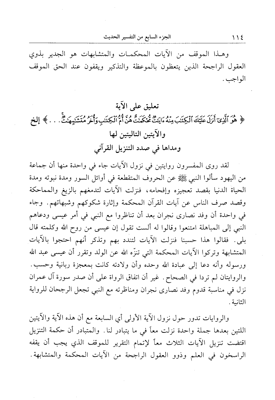 تعليق على الآية هُوَ الَّذِي أَنْزَلَ عَلَيْكَ الْكِتابَ مِنْهُ آياتٌ مُحْكَماتٌ هُنَّ أُمُّ الْكِتابِ وَأُخَرُ مُتَشابِهاتٌ ... إلخ والآيتين التاليتين لها ومداها في صدد التنزيل القرآني