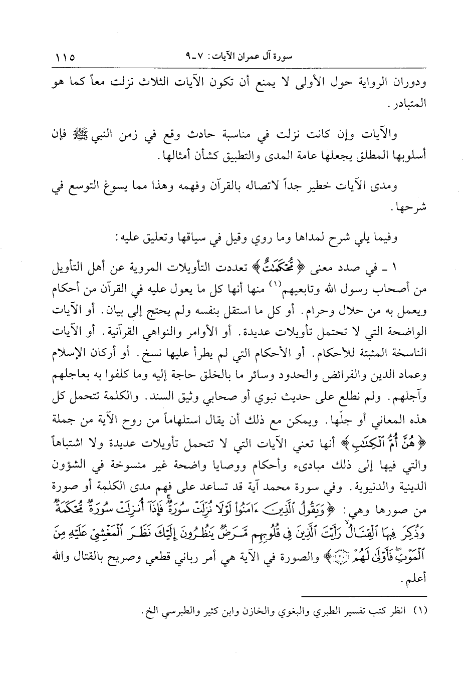 1- في صدد معنى مُحْكَماتٌ تعددت التأويلات المروية عن أهل التأويل من أصحاب رسول الله وتابعيهم «1» منها أنها كل ما يعول عليه في القرآن من أحكام ويعمل به من حلال وحرام. أو كل ما استقل بنفسه ولم يحتج إلى بيان. أو الآيات الواضحة التي لا تحتمل تأويلات عديدة. أو الأوامر والنواهي القرآنية. أو الآيات الناسخة المثبتة للأحكام. أو الأحكام التي لم يطرأ عليها نسخ. أو أركان الإسلام وعماد الدين والفرائض والحدود وسائر ما بالخلق حاجة إليه وما كلفوا به بعاجلهم وآجلهم. ولم نطلع على حديث نبوي أو صحابي وثيق السند. والكلمة تتحمل كل هذه المعاني أو جلّها. ويمكن مع ذلك أن يقال استلهاما من روح الآية من جملة هُنَّ أُمُّ الْكِتابِ أنها تعني الآيات التي لا تتحمل تأويلات عديدة ولا اشتباها والتي فيها إلى ذلك مبادئ وأحكام ووصايا واضحة غير منسوخة في الشؤون الدينية والدنيوية. وفي سورة محمد آية قد تساعد على فهم مدى الكلمة أو صورة من صورها وهي: وَيَقُولُ الَّذِينَ آمَنُوا لَوْلا نُزِّلَتْ سُورَةٌ فَإِذا أُنْزِلَتْ سُورَةٌ مُحْكَمَةٌ وَذُكِرَ فِيهَا الْقِتالُ رَأَيْتَ الَّذِينَ فِي قُلُوبِهِمْ مَرَضٌ يَنْظُرُونَ إِلَيْكَ نَظَرَ الْمَغْشِيِّ عَلَيْهِ مِنَ الْمَوْتِ فَأَوْلى لَهُمْ (20) والصورة في الآية هي أمر رباني قطعي وصريح بالقتال والله أعلم.
