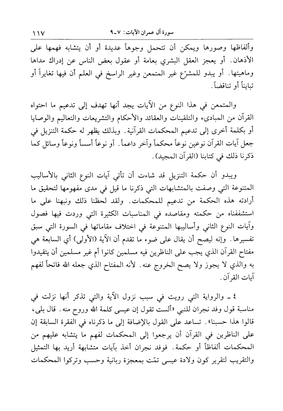 4- والرواية التي رويت في سبب نزول الآية والتي تذكر أنها نزلت في مناسبة قول وفد نجران للنبي «ألست تقول إن عيسى كلمة الله وروح منه. قال بلى، قالوا هذا حسبنا» . تساعد على القول بالإضافة إلى ما ذكرناه في الفقرة السابقة إن على الناظرين في القرآن أن يرجعوا إلى المحكمات لفهم ما يتشابه عليهم من المحكمات ألفاظا أو حكمة. فوفد نجران أخذ بآيات متشابهة أريد بها التمثيل والتقريب لتقرير كون ولادة عيسى تمّت بمعجزة ربانية وحسب وتركوا المحكمات