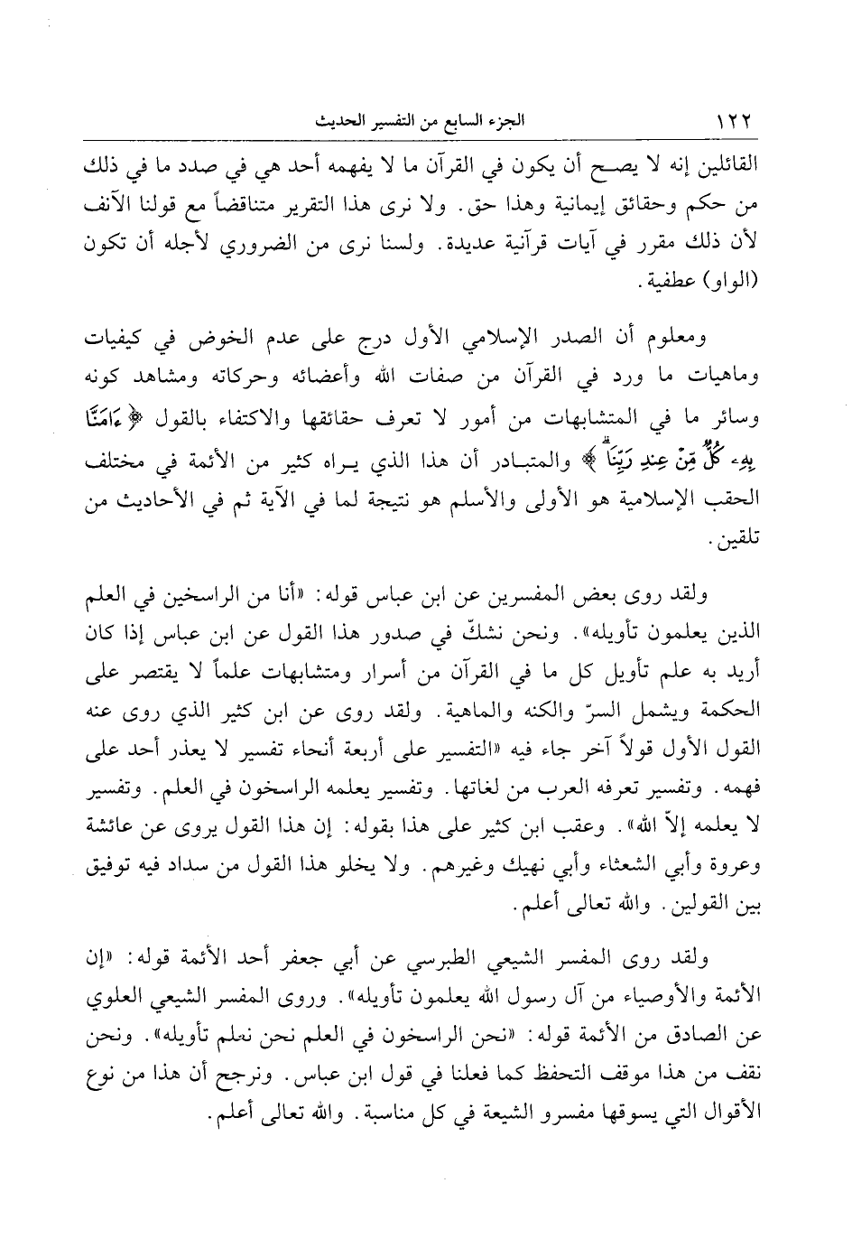 القائلين إنه لا يصح أن يكون في القرآن ما لا يفهمه أحد هي في صدد ما في ذلك من حكم وحقائق إيمانية وهذا حق. ولا نرى هذا التقرير متناقضا مع قولنا الآنف لأن ذلك مقرر في آيات قرآنية عديدة. ولسنا نرى من الضروري لأجله أن تكون (الواو) عطفية.