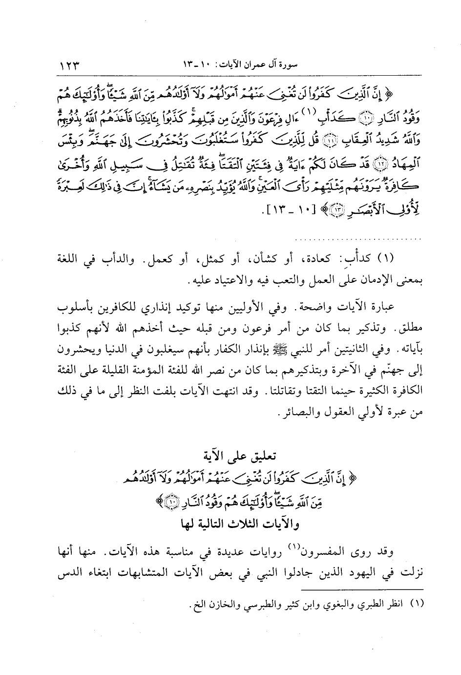 إِنَّ الَّذِينَ كَفَرُوا لَنْ تُغْنِيَ عَنْهُمْ أَمْوالُهُمْ وَلا أَوْلادُهُمْ مِنَ اللَّهِ شَيْئاً وَأُولئِكَ هُمْ وَقُودُ النَّارِ (10) كَدَأْبِ آلِ فِرْعَوْنَ وَالَّذِينَ مِنْ قَبْلِهِمْ كَذَّبُوا بِآياتِنا فَأَخَذَهُمُ اللَّهُ بِذُنُوبِهِمْ وَاللَّهُ شَدِيدُ الْعِقابِ (11) قُلْ لِلَّذِينَ كَفَرُوا سَتُغْلَبُونَ وَتُحْشَرُونَ إِلى جَهَنَّمَ وَبِئْسَ الْمِهادُ (12) قَدْ كانَ لَكُمْ آيَةٌ فِي فِئَتَيْنِ الْتَقَتا فِئَةٌ تُقاتِلُ فِي سَبِيلِ اللَّهِ وَأُخْرى كافِرَةٌ يَرَوْنَهُمْ مِثْلَيْهِمْ رَأْيَ الْعَيْنِ وَاللَّهُ يُؤَيِّدُ بِنَصْرِهِ مَنْ يَشاءُ إِنَّ فِي ذلِكَ لَعِبْرَةً لِأُولِي الْأَبْصارِ (13)