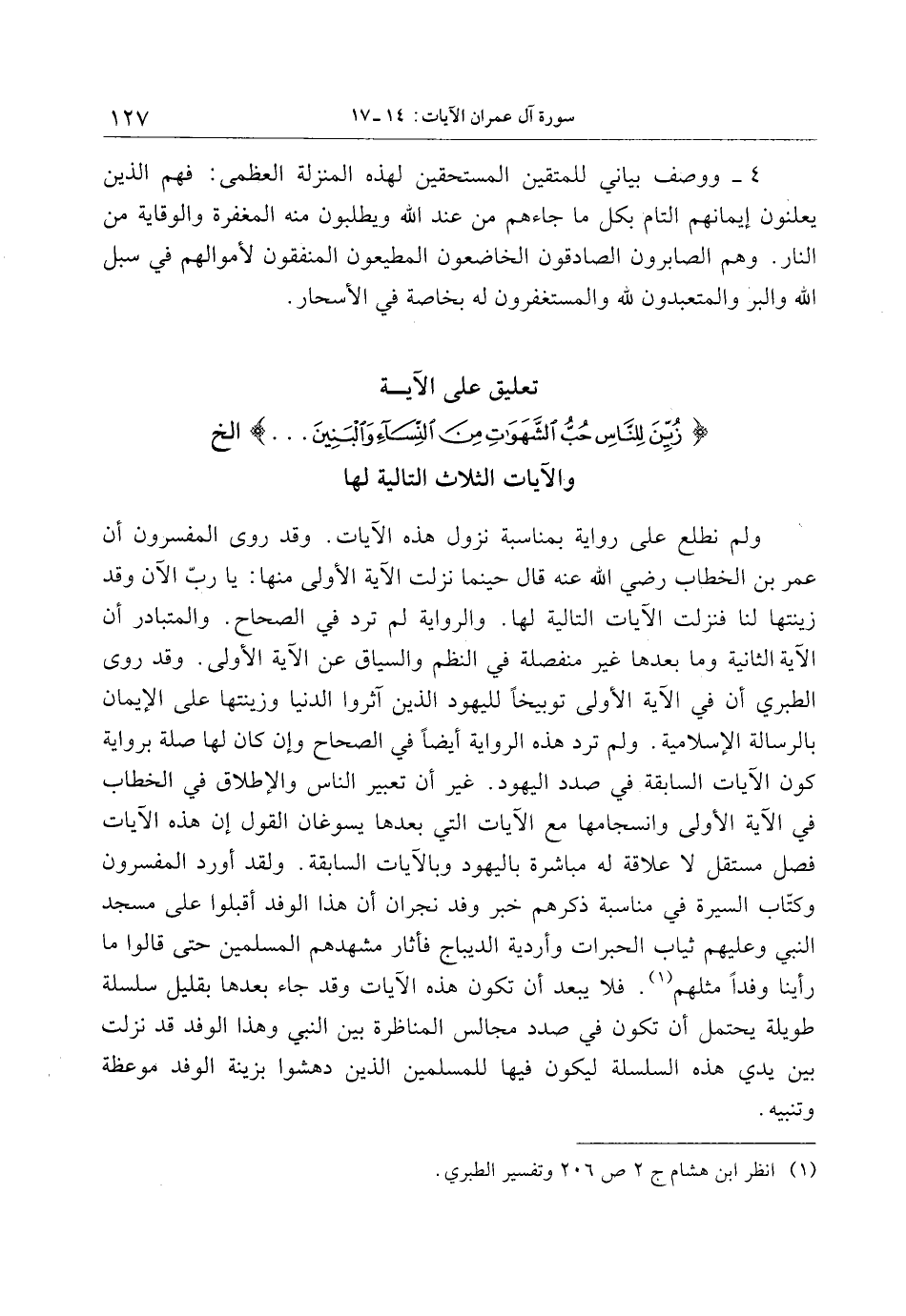 ولم نطلع على رواية بمناسبة نزول هذه الآيات. وقد روى المفسرون أن عمر بن الخطاب رضي الله عنه قال حينما نزلت الآية الأولى منها: يا ربّ الآن وقد زينتها لنا فنزلت الآيات التالية لها. والرواية لم ترد في الصحاح. والمتبادر أن الآية الثانية وما بعدها غير منفصلة في النظم والسياق عن الآية الأولى. وقد روى الطبري أن في الآية الأولى توبيخا لليهود الذين آثروا الدنيا وزينتها على الإيمان بالرسالة الإسلامية. ولم ترد هذه الرواية أيضا في الصحاح وإن كان لها صلة برواية كون الآيات السابقة في صدد اليهود. غير أن تعبير الناس والإطلاق في الخطاب في الآية الأولى وانسجامها مع الآيات التي بعدها يسوغان القول إن هذه الآيات فصل مستقل لا علاقة له مباشرة باليهود وبالآيات السابقة. ولقد أورد المفسرون وكتّاب السيرة في مناسبة ذكرهم خبر وفد نجران أن هذا الوفد أقبلوا على مسجد النبي وعليهم ثياب الحبرات وأردية الديباج فأثار مشهدهم المسلمين حتى قالوا ما رأينا وفدا مثلهم «1» . فلا يبعد أن تكون هذه الآيات وقد جاء بعدها بقليل سلسلة طويلة يحتمل أن تكون في صدد مجالس المناظرة بين النبي وهذا الوفد قد نزلت بين يدي هذه السلسلة ليكون فيها للمسلمين الذين دهشوا بزينة الوفد موعظة وتنبيه.