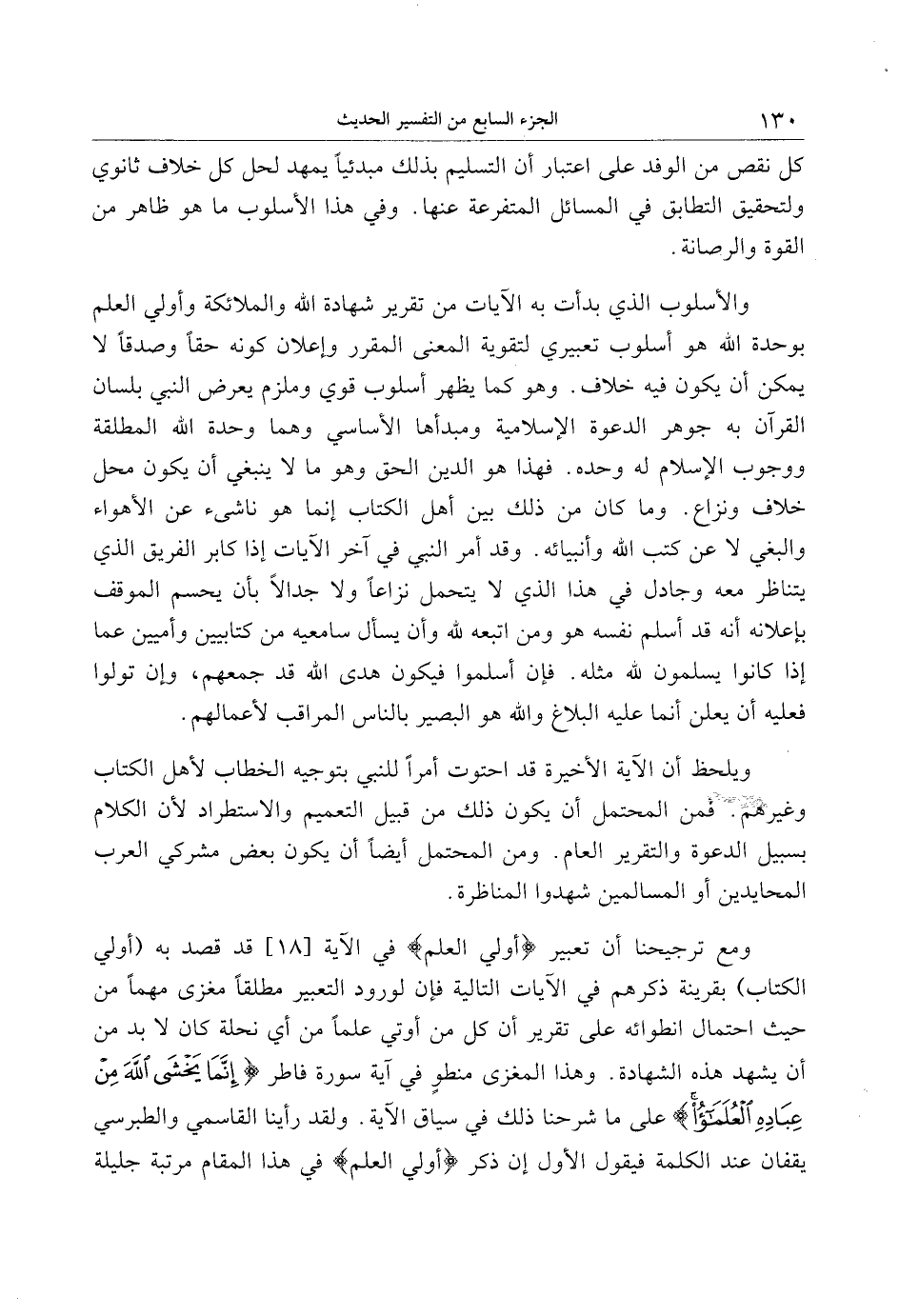 ومع ترجيحنا أن تعبير أُولُوا الْعِلْمِ في الآية [18] قد قصد به (أولي الكتاب) بقرينة ذكرهم في الآيات التالية فإن لورود التعبير مطلقا مغزى مهما من حيث احتمال انطوائه على تقرير أن كل من أوتي علما من أي نحلة كان لا بد من أن يشهد هذه الشهادة. وهذا المغزى منطو في آية سورة فاطر إِنَّما يَخْشَى اللَّهَ مِنْ عِبادِهِ الْعُلَماءُ على ما شرحنا ذلك في سياق الآية. ولقد رأينا القاسمي والطبرسي يقفان عند الكلمة فيقول الأول إن ذكر أولي العلم في هذا المقام مرتبة جليلة