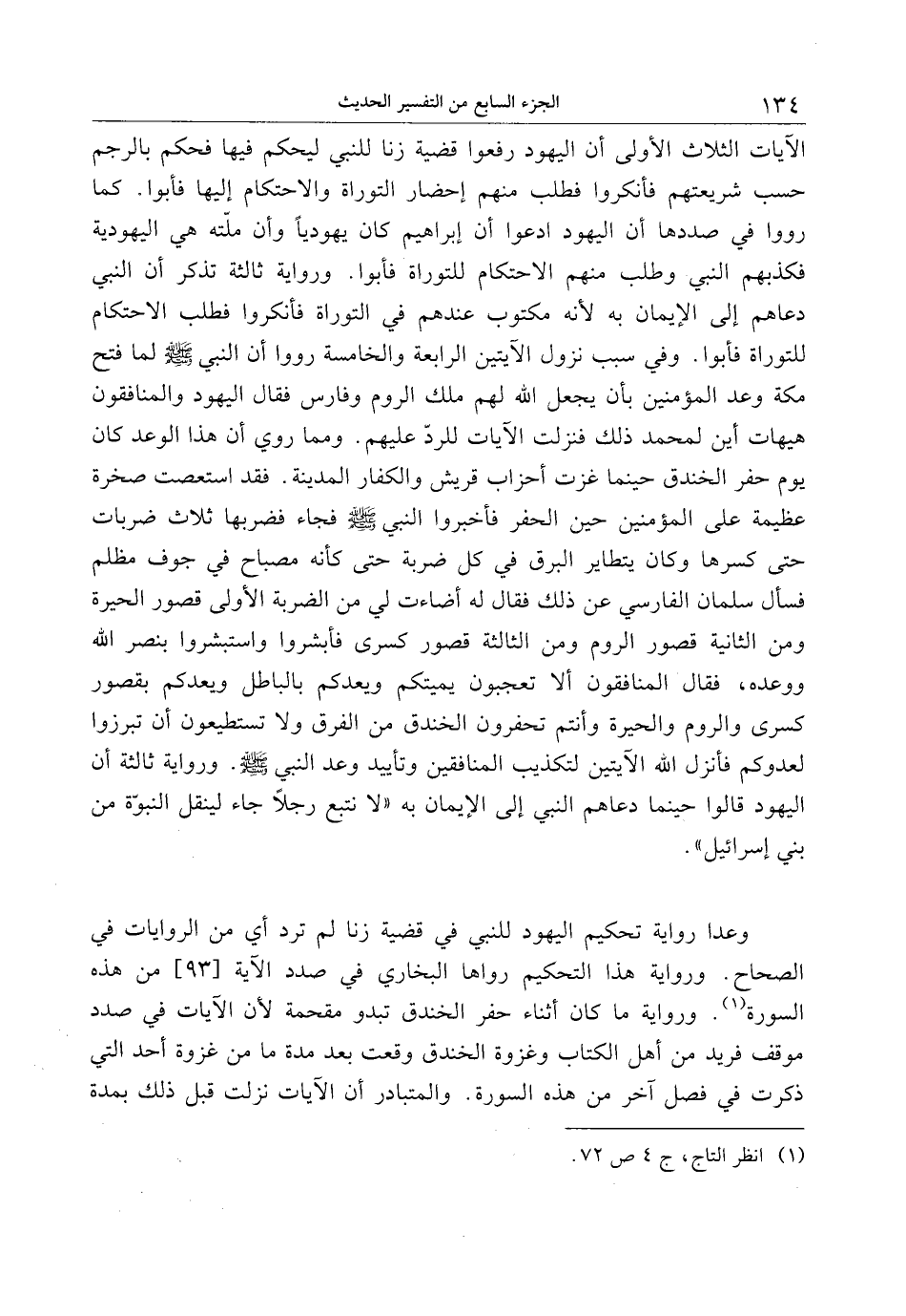 وعدا رواية تحكيم اليهود للنبي في قضية زنا لم ترد أي من الروايات في الصحاح. ورواية هذا التحكيم رواها البخاري في صدد الآية [93] من هذه السورة «1» . ورواية ما كان أثناء حفر الخندق تبدو مقحمة لأن الآيات في صدد موقف فريد من أهل الكتاب وغزوة الخندق وقعت بعد مدة ما من غزوة أحد التي ذكرت في فصل آخر من هذه السورة. والمتبادر أن الآيات نزلت قبل ذلك بمدة