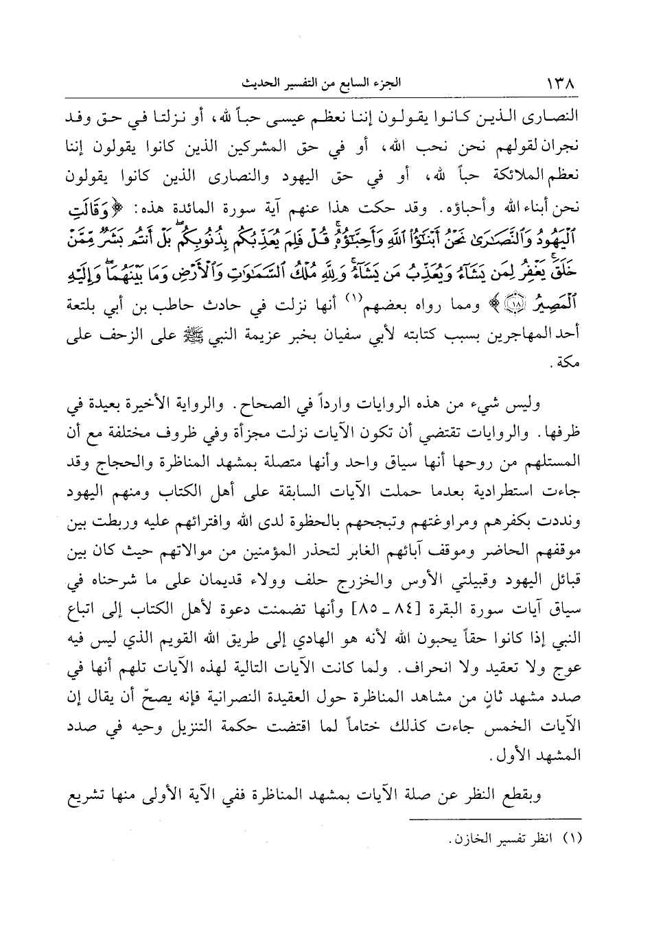 وليس شيء من هذه الروايات واردا في الصحاح. والرواية الأخيرة بعيدة في ظرفها. والروايات تقتضي أن تكون الآيات نزلت مجزأة وفي ظروف مختلفة مع أن المستلهم من روحها أنها سياق واحد وأنها متصلة بمشهد المناظرة والحجاج وقد جاءت استطرادية بعد ما حملت الآيات السابقة على أهل الكتاب ومنهم اليهود ونددت بكفرهم ومراوغتهم وتبجحهم بالحظوة لدى الله وافترائهم عليه وربطت بين موقفهم الحاضر وموقف آبائهم الغابر لتحذر المؤمنين من موالاتهم حيث كان بين قبائل اليهود وقبيلتي الأوس والخزرج حلف وولاء قديمان على ما شرحناه في سياق آيات سورة البقرة [84- 85] وأنها تضمنت دعوة لأهل الكتاب إلى اتباع النبي إذا كانوا حقا يحبون الله لأنه هو الهادي إلى طريق الله القويم الذي ليس فيه عوج ولا تعقيد ولا انحراف. ولما كانت الآيات التالية لهذه الآيات تلهم أنها في صدد مشهد ثان من مشاهد المناظرة حول العقيدة النصرانية فإنه يصحّ أن يقال إن الآيات الخمس جاءت كذلك ختاما لما اقتضت حكمة التنزيل وحيه في صدد المشهد الأول.
