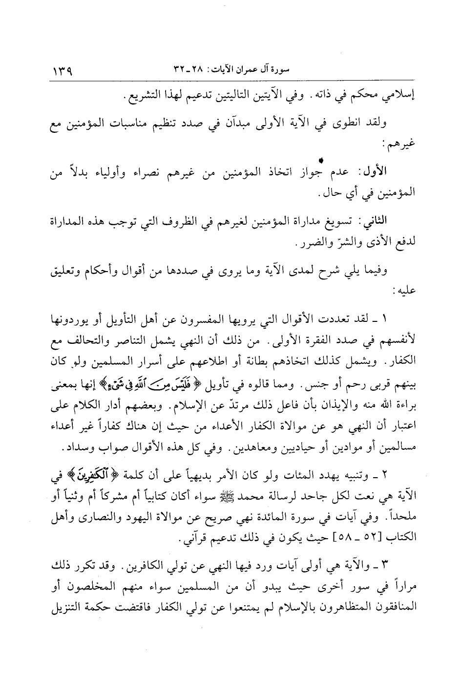 2- وتنبيه يهدد المئات ولو كان الأمر بديهيا على أن كلمة الْكافِرِينَ في الآية هي نعت لكل جاحد لرسالة محمد صلى الله عليه وسلم سواء أكان كتابيا أم مشركا أم وثنيا أو ملحدا. وفي آيات في سورة المائدة نهي صريح عن موالاة اليهود والنصارى وأهل الكتاب [52- 58] حيث يكون في ذلك تدعيم قرآني.