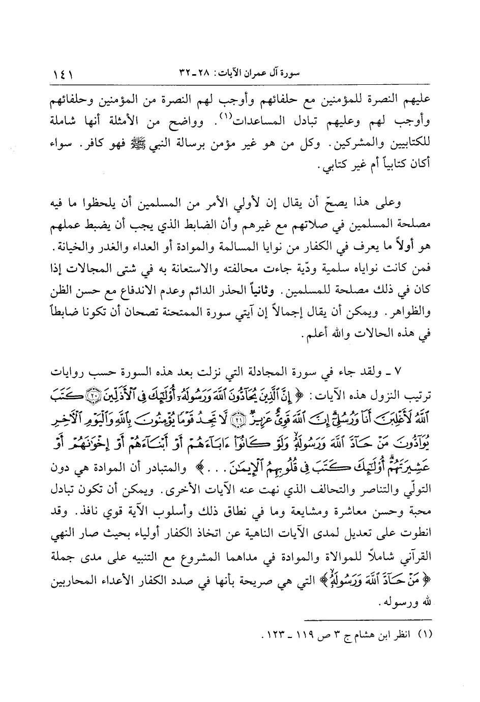 7- ولقد جاء في سورة المجادلة التي نزلت بعد هذه السورة حسب روايات ترتيب النزول هذه الآيات: إِنَّ الَّذِينَ يُحَادُّونَ اللَّهَ وَرَسُولَهُ أُولئِكَ فِي الْأَذَلِّينَ (20) كَتَبَ اللَّهُ لَأَغْلِبَنَّ أَنَا وَرُسُلِي إِنَّ اللَّهَ قَوِيٌّ عَزِيزٌ (21) لا تَجِدُ قَوْماً يُؤْمِنُونَ بِاللَّهِ وَالْيَوْمِ الْآخِرِ يُوادُّونَ مَنْ حَادَّ اللَّهَ وَرَسُولَهُ وَلَوْ كانُوا آباءَهُمْ أَوْ أَبْناءَهُمْ أَوْ إِخْوانَهُمْ أَوْ عَشِيرَتَهُمْ أُولئِكَ كَتَبَ فِي قُلُوبِهِمُ الْإِيمانَ ... والمتبادر أن الموادة هي دون التولّي والتناصر والتحالف الذي نهت عنه الآيات الأخرى. ويمكن أن تكون تبادل محبة وحسن معاشرة ومشايعة وما في نطاق ذلك وأسلوب الآية قوي نافذ. وقد انطوت على تعديل لمدى الآيات الناهية عن اتخاذ الكفار أولياء بحيث صار النهي القرآني شاملا للموالاة والموادة في مداهما المشروع مع التنبيه على مدى جملة مَنْ حَادَّ اللَّهَ وَرَسُولَهُ التي هي صريحة بأنها في صدد الكفار الأعداء المحاربين لله ورسوله.