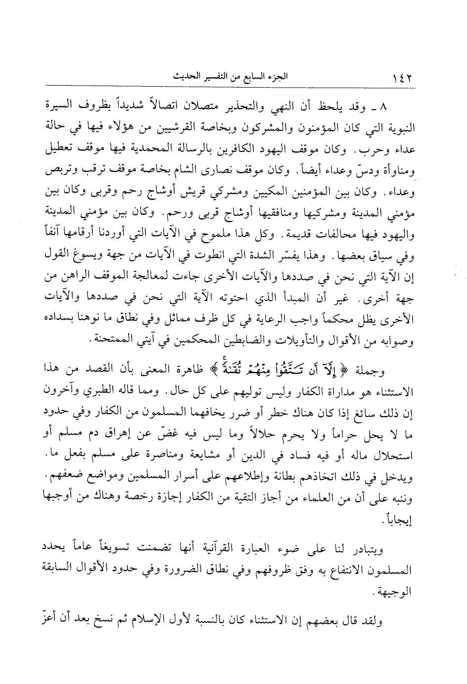 8- وقد يلحظ أن النهي والتحذير متصلان اتصالا شديدا بظروف السيرة النبوية التي كان المؤمنون والمشركون وبخاصة القرشيين من هؤلاء فيها في حالة عداء وحرب. وكان موقف اليهود الكافرين بالرسالة المحمدية فيها موقف تعطيل ومناوأة ودسّ وعداء أيضا. وكان موقف نصارى الشام بخاصة موقف ترقب وتربص وعداء. وكان بين المؤمنين المكيين ومشركي قريش أوشاج رحم وقربى وكان بين مؤمني المدينة ومشركيها ومنافقيها أوشاج قربى ورحم. وكان بين مؤمني المدينة واليهود فيها محالفات قديمة. وكل هذا ملموح في الآيات التي أوردنا أرقامها آنفا وفي سياق بعضها. وهذا يفسّر الشدة التي انطوت في الآيات من جهة ويسوغ القول إن الآية التي نحن في صددها والآيات الأخرى جاءت لمعالجة الموقف الراهن من جهة أخرى. غير أن المبدأ الذي احتوته الآية التي نحن في صددها والآيات الأخرى يظل محكما واجب الرعاية في كل ظرف مماثل وفي نطاق ما نوهنا بسداده وصوابه من الأقوال والتأويلات والضابطين المحكمين في آيتي الممتحنة.