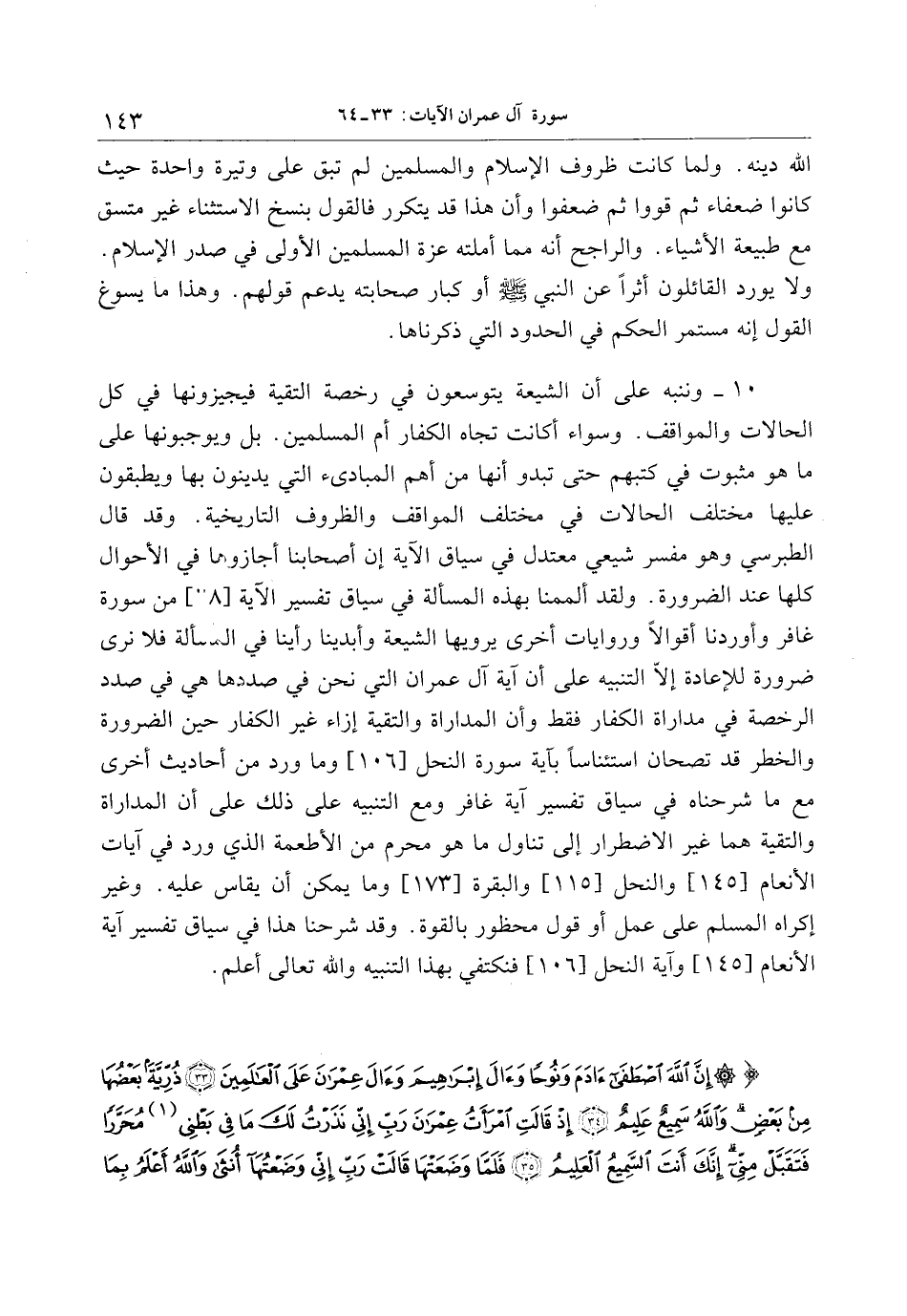 10- وننبه على أن الشيعة يتوسعون في رخصة التقية فيجيزونها في كل الحالات والمواقف. وسواء أكانت تجاه الكفار أم المسلمين. بل ويوجبونها على ما هو مثبوت في كتبهم حتى تبدو أنها من أهم المبادئ التي يدينون بها ويطبقون عليها مختلف الحالات في مختلف المواقف والظروف التاريخية. وقد قال الطبرسي وهو مفسر شيعي معتدل في سياق الآية إن أصحابنا أجازوها في الأحوال كلها عند الضرورة. ولقد ألممنا بهذه المسألة في سياق تفسير الآية [28] من سورة غافر وأوردنا أقوالا وروايات أخرى يرويها الشيعة وأبدينا رأينا في المسألة فلا نرى ضرورة للإعادة إلّا التنبيه على أن آية آل عمران التي نحن في صددها هي في صدد الرخصة في مداراة الكفار فقط وأن المداراة والتقية إزاء غير الكفار حين الضرورة والخطر قد تصحان استئناسا بآية سورة النحل [106] وما ورد من أحاديث أخرى مع ما شرحناه في سياق تفسير آية غافر ومع التنبيه على ذلك على أن المداراة والتقية هما غير الاضطرار إلى تناول ما هو محرم من الأطعمة الذي ورد في آيات الأنعام [145] والنحل [115] والبقرة [173] وما يمكن أن يقاس عليه. وغير إكراه المسلم على عمل أو قول محظور بالقوة. وقد شرحنا هذا في سياق تفسير آية الأنعام [145] وآية النحل [106] فنكتفي بهذا التنبيه والله تعالى أعلم.